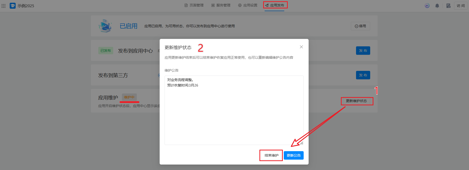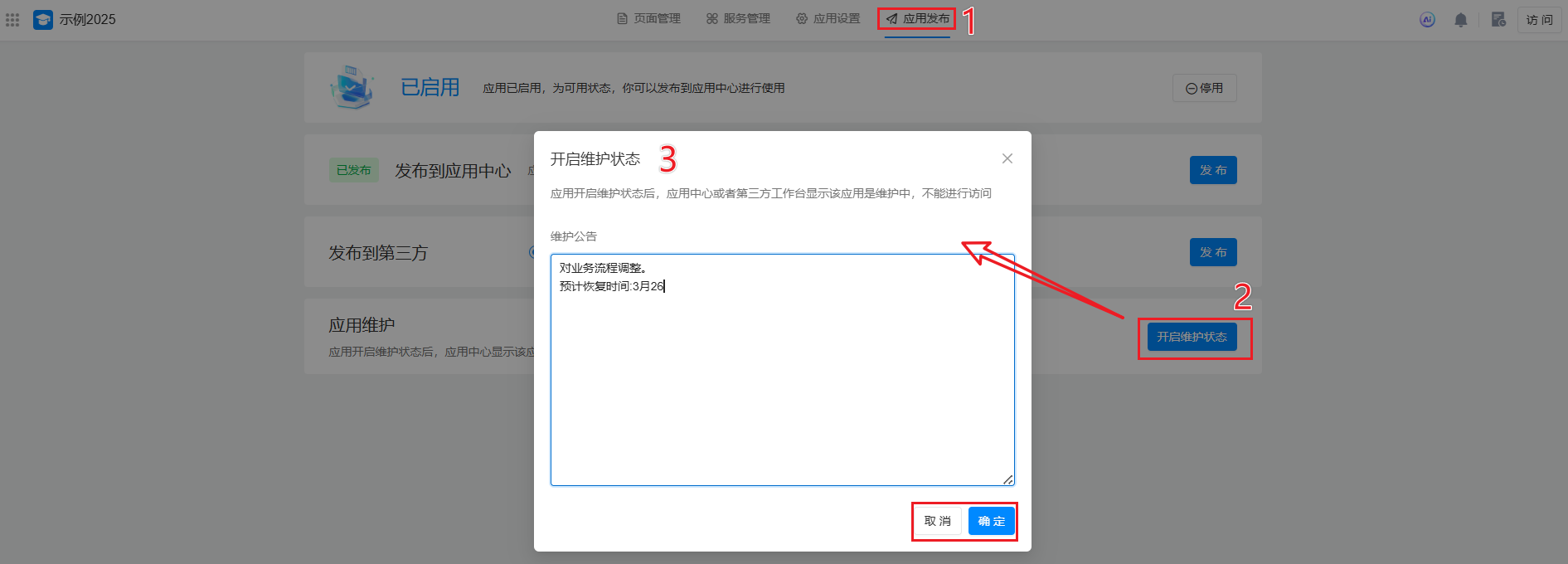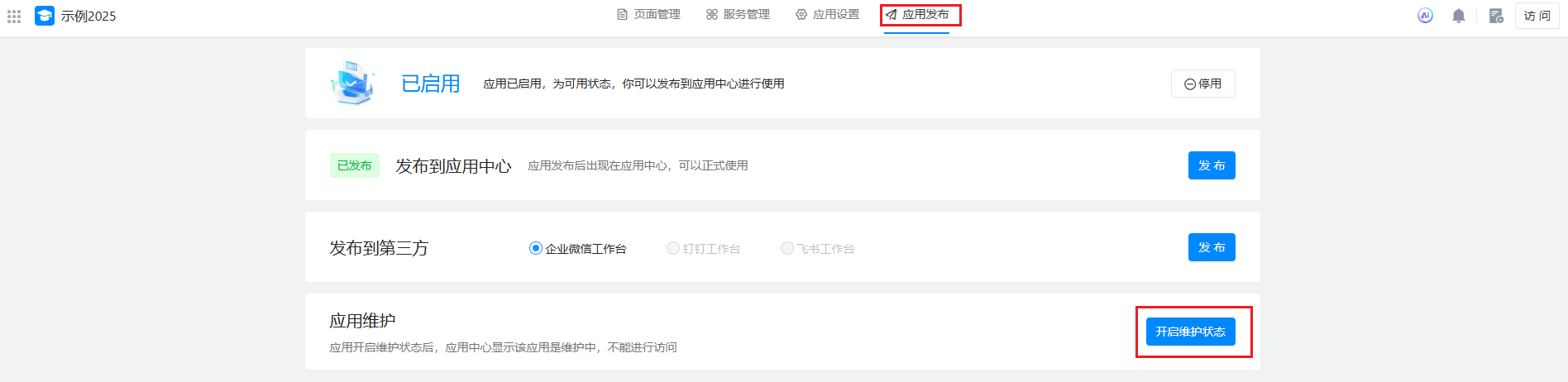 - 只有应用管理员可设置应用维护状态。