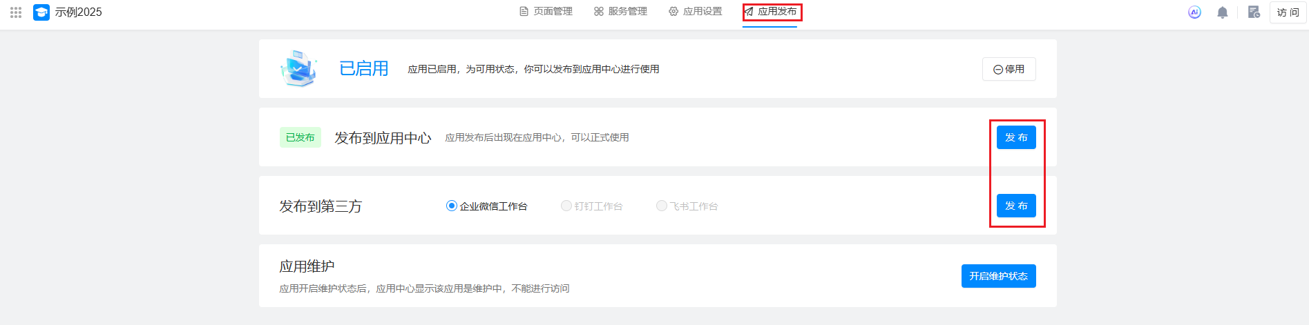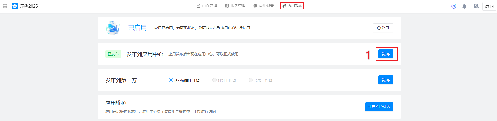应用搭建应用发布发布本页总览发布 通过应用发布的设置,可以选择应用允许哪些设备终端显示,也可以发布到第三方平台,并支持隐藏指定的页面元素。 发布到应用中心 在"应用发布" > "发布"页面, 发布到第三方
