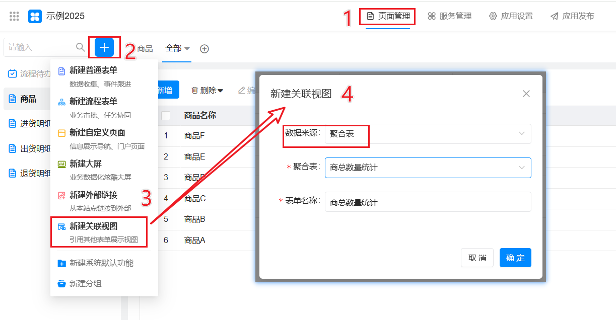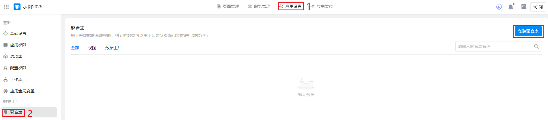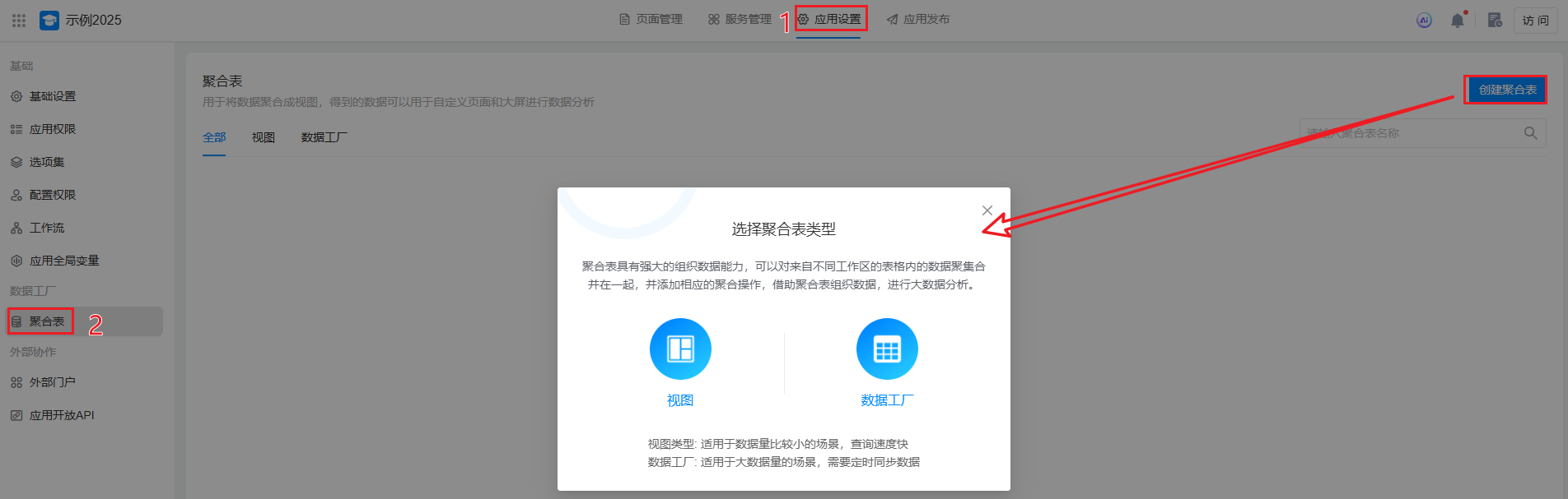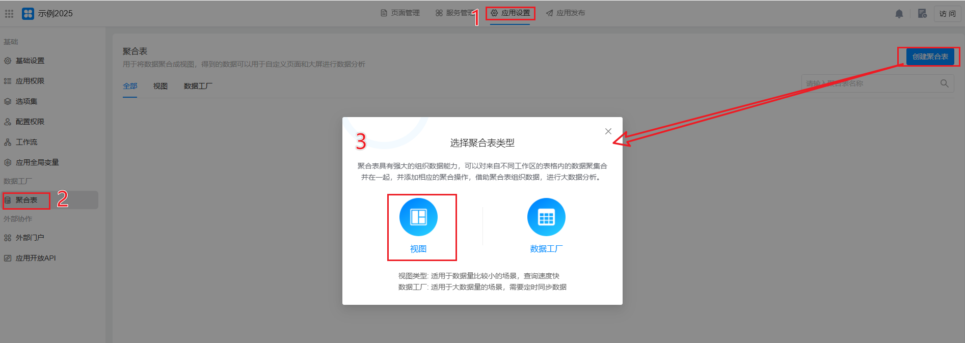 通过「 应用设置 》聚合表 」进入聚合表界面后,点击「创建聚合表」,聚合表类型选择视图