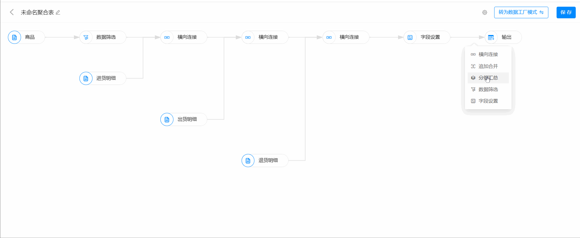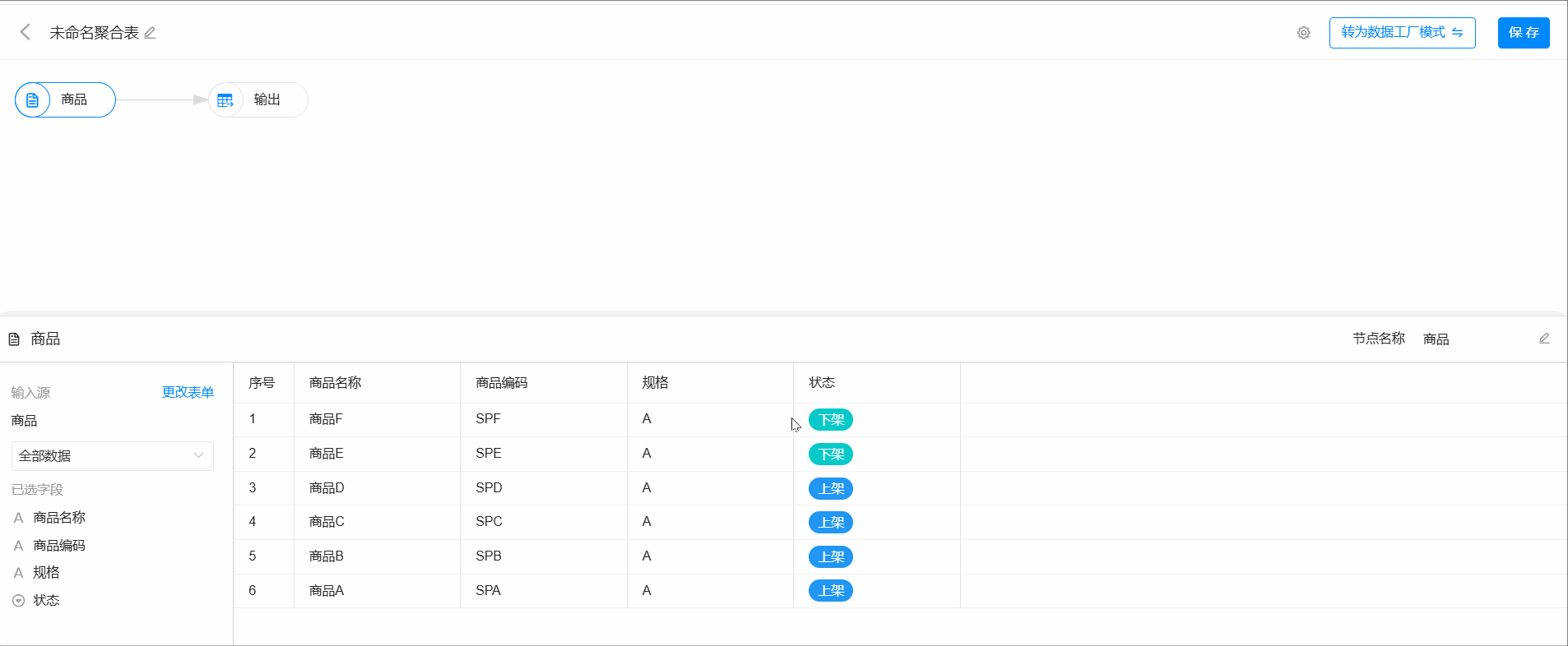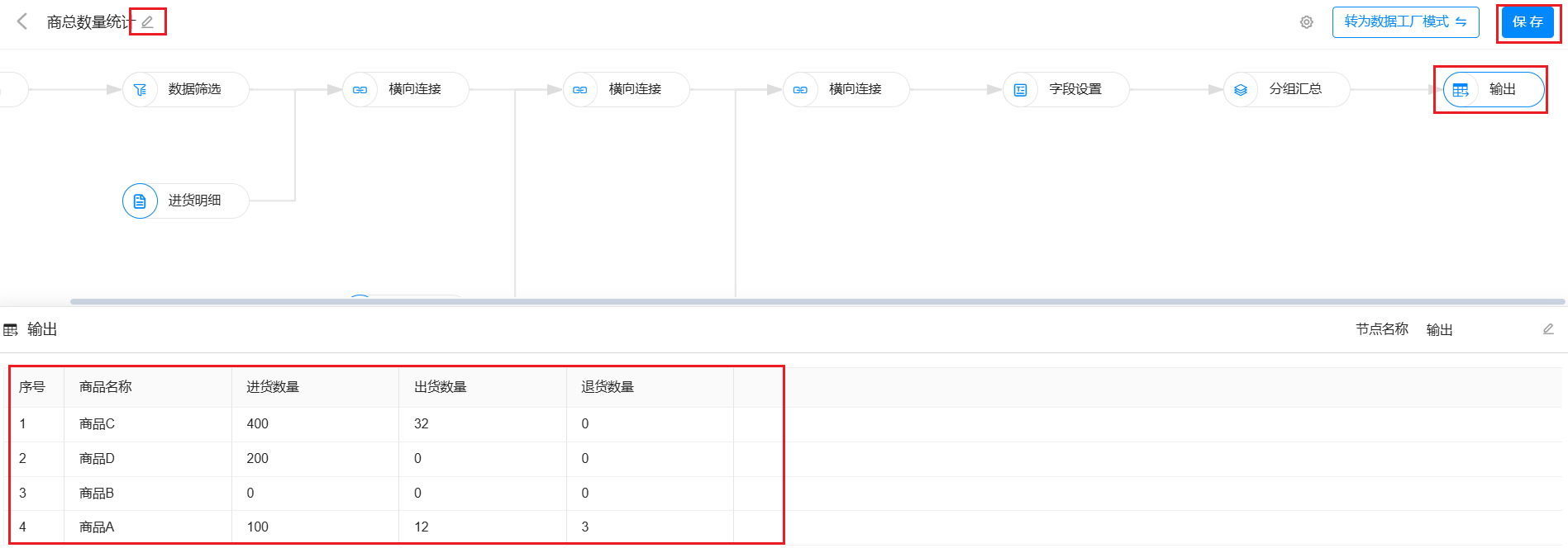 配置完成后,点击"输出",查看预览数据。确认无误后修改聚合表名称并保存。
