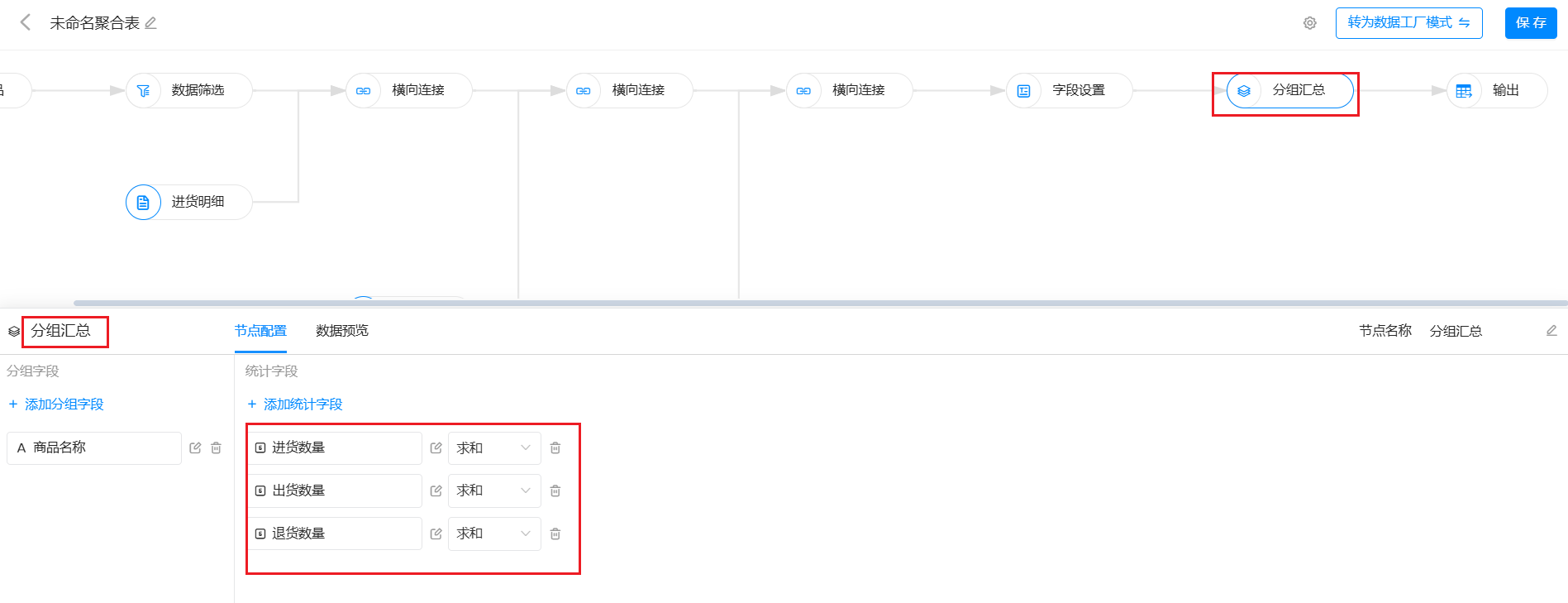 本场景中,我们需要按产品名称分组。对进货数量,出货数量,退货数量进行统计求和。