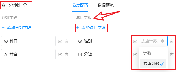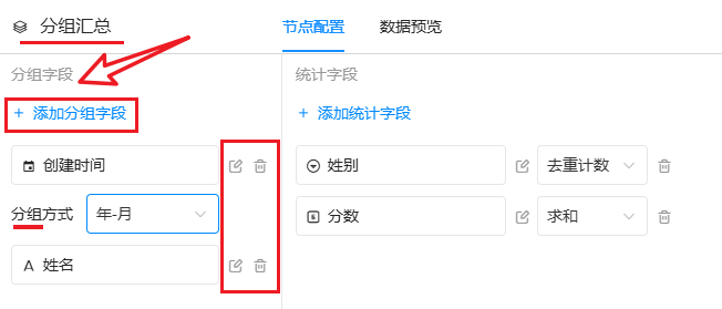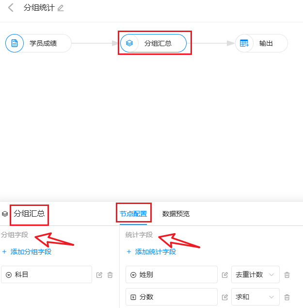 分组汇总 的节点配置包括「分组字段」设置和「统计字段」