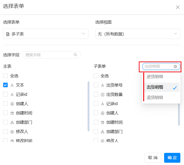 - 同时选择了主表和子表字段后,原来带有多条子表单数据的主表数据会拆成一条条的数据。