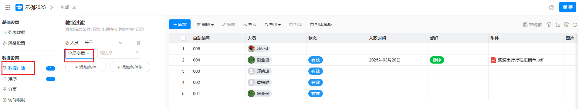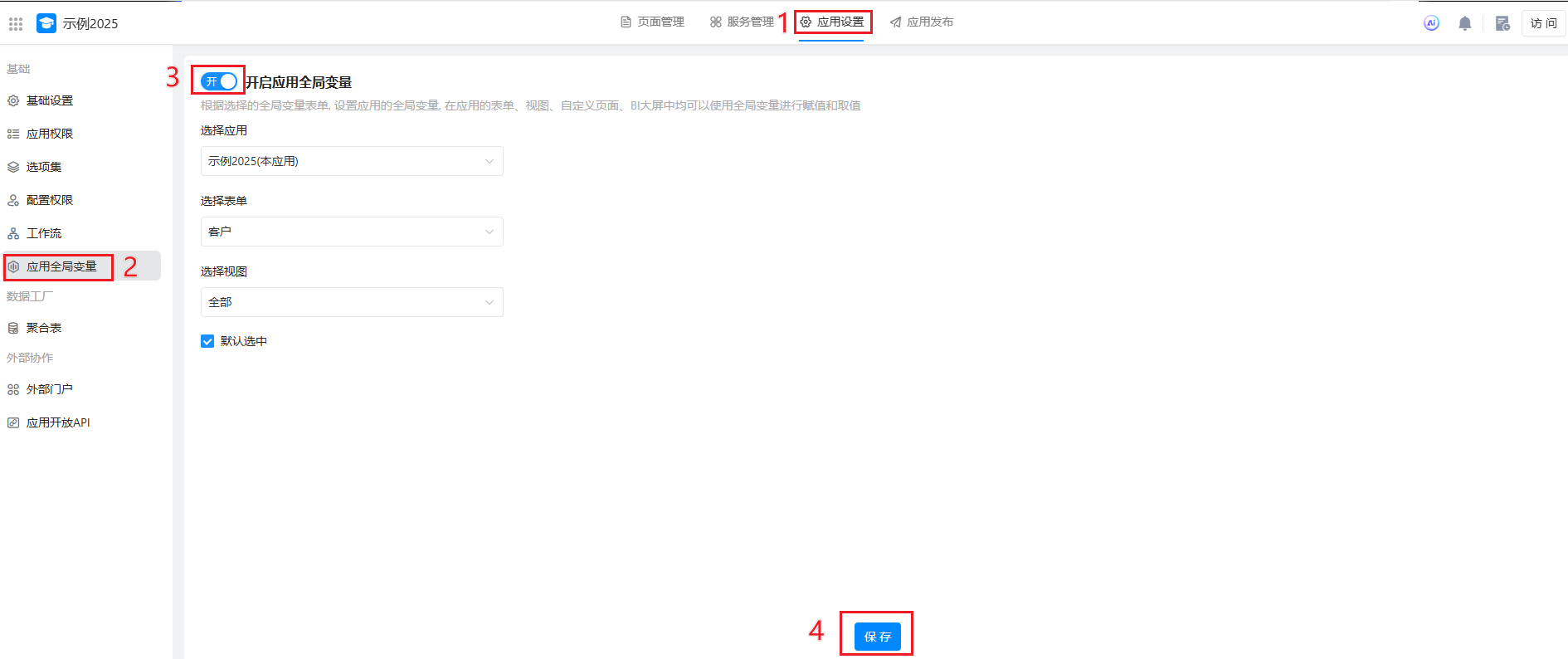 应用管理员进入「 应用设置 》应用全局变量 」开启“开启应用全局变量”,即可新建全局变量。