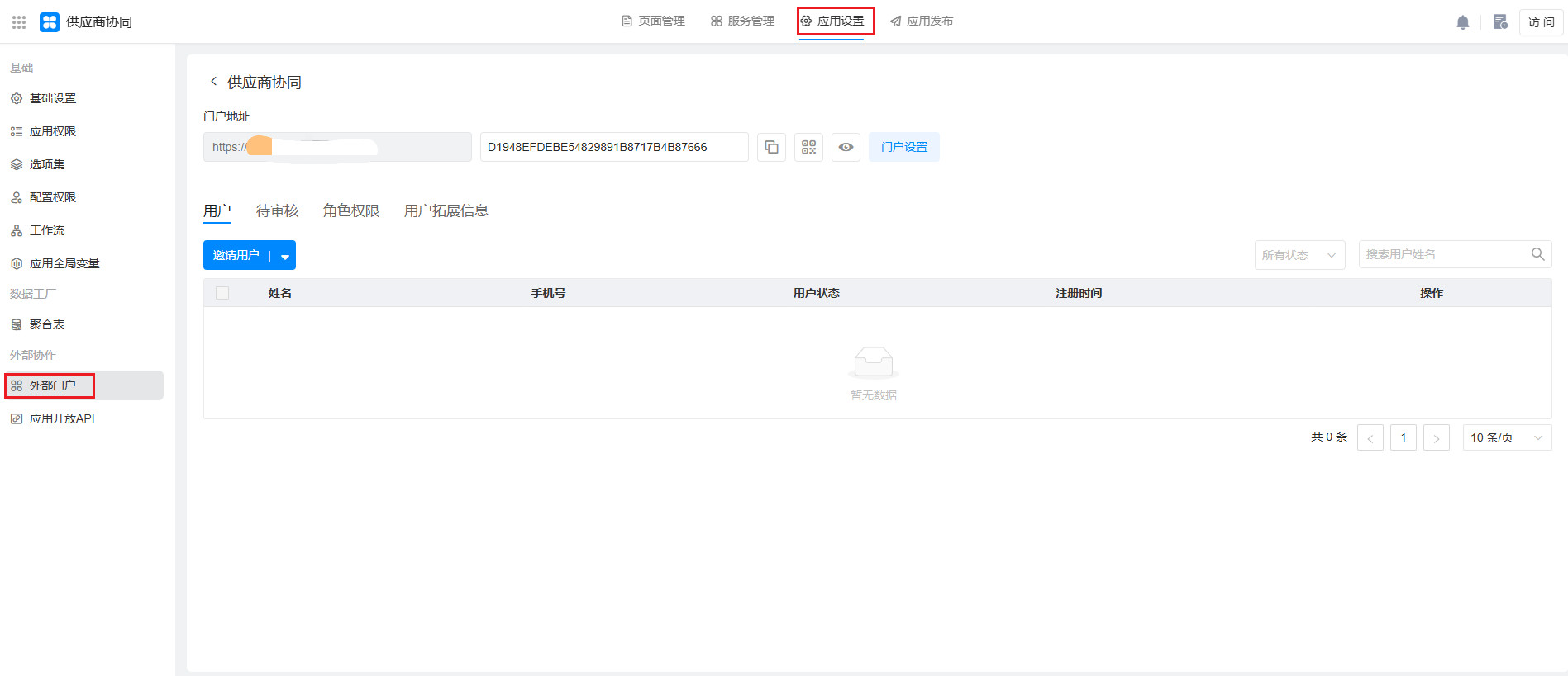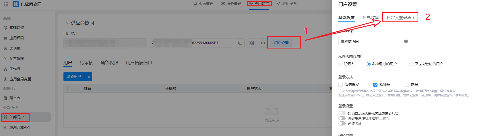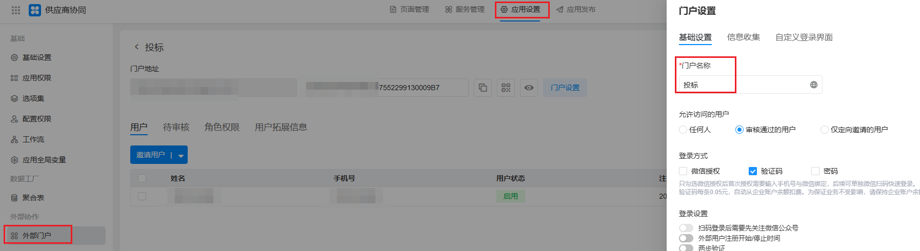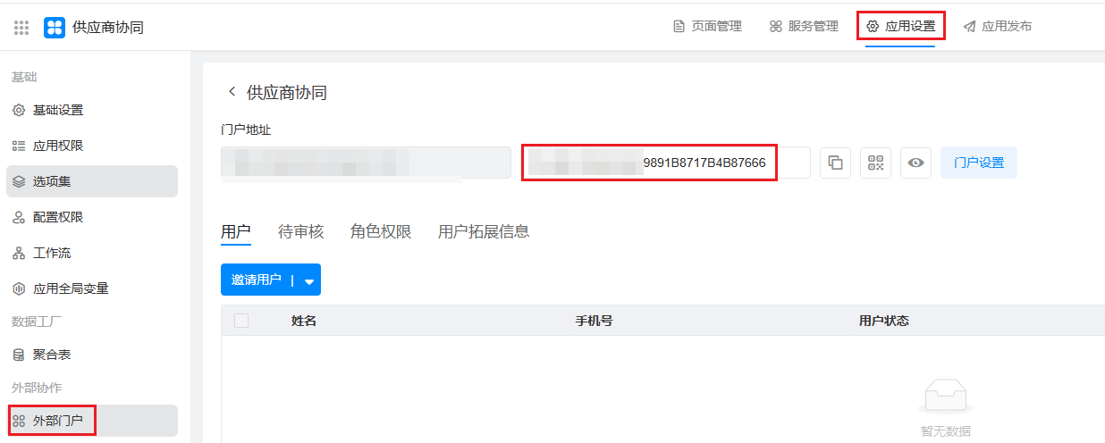 在「 我的应用> 《供应商协同》 >应用设置>外部门户`」,点击启用外部门户,选择个人外部门户。