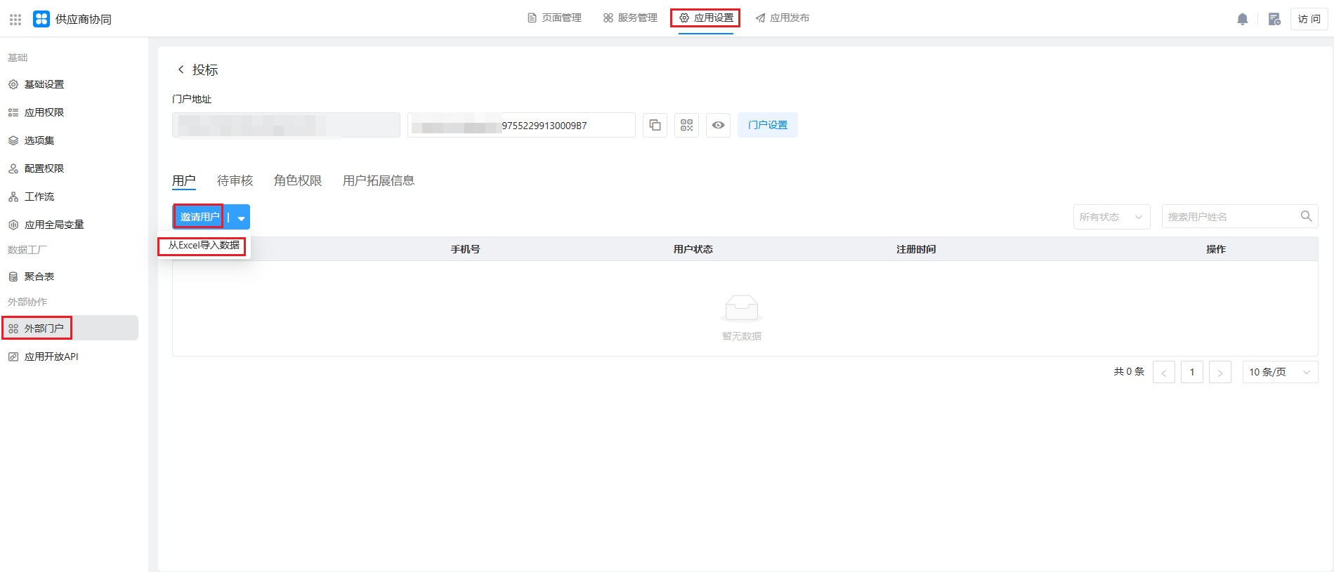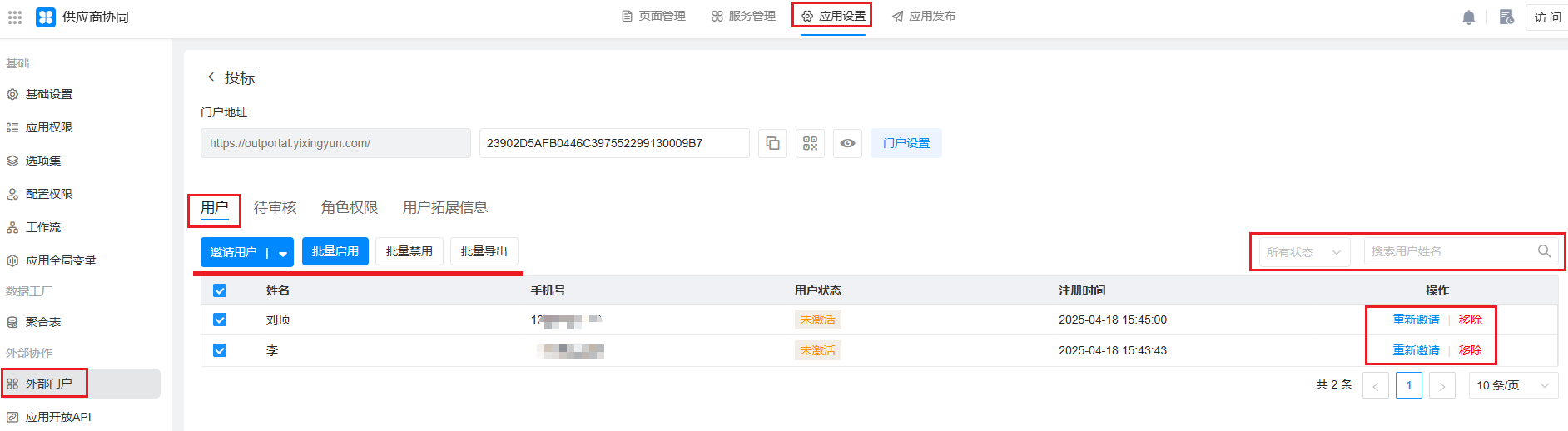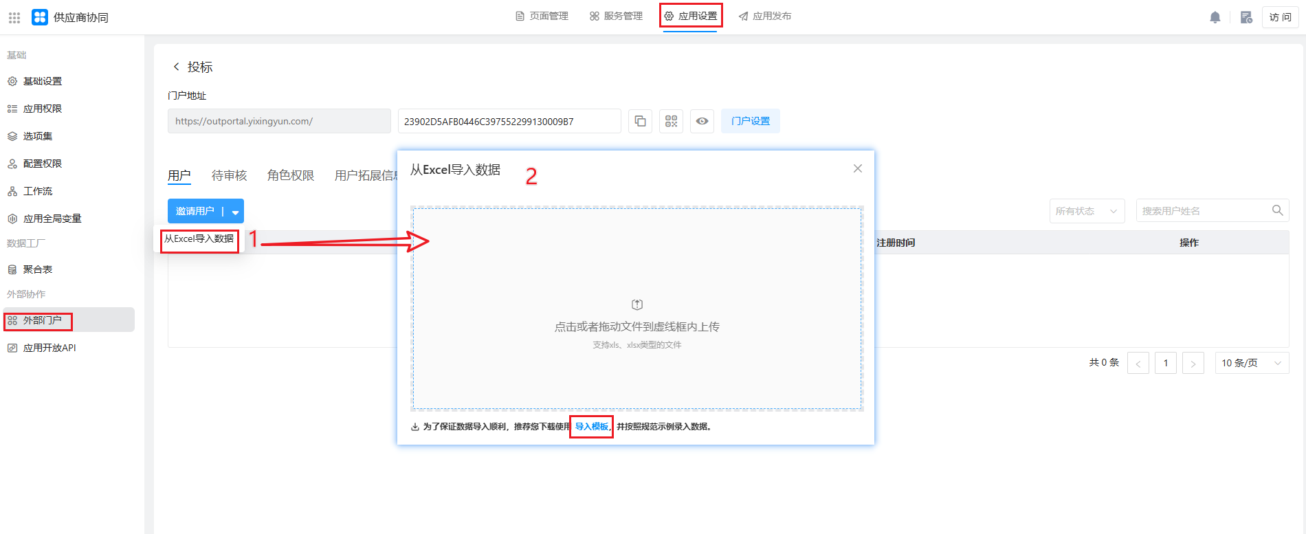 在「 我的应用> 《供应商协同》 >应用设置>外部门户`」,点击启用外部门户,选择个人外部门户。