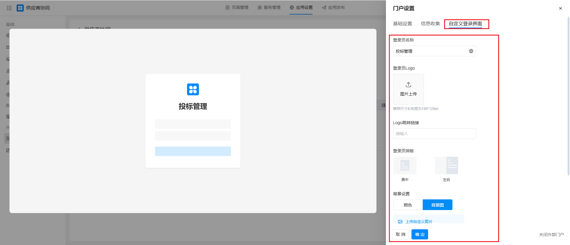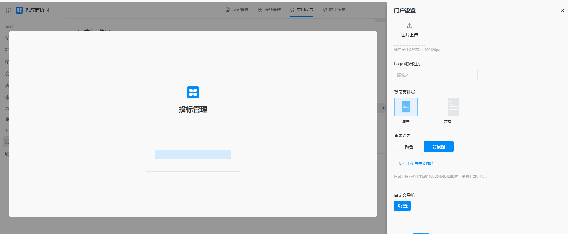 可以配置登录页面的名称、Logo、页排版、背景图、背景色或自定义导航。