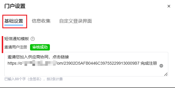 短信通知内容 对于邀请、审核通过、审核拒绝的短信通知,可以单独设置内容。