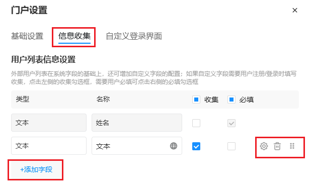- 勾选【收集】,则在页面中显示此字段。
