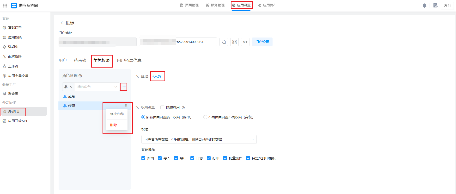 外部人员的角色权限需要单独配置,和内部常规成员配置不在一个地方,但是角色权限的配置方法和应用角色相同,这里不再介绍。