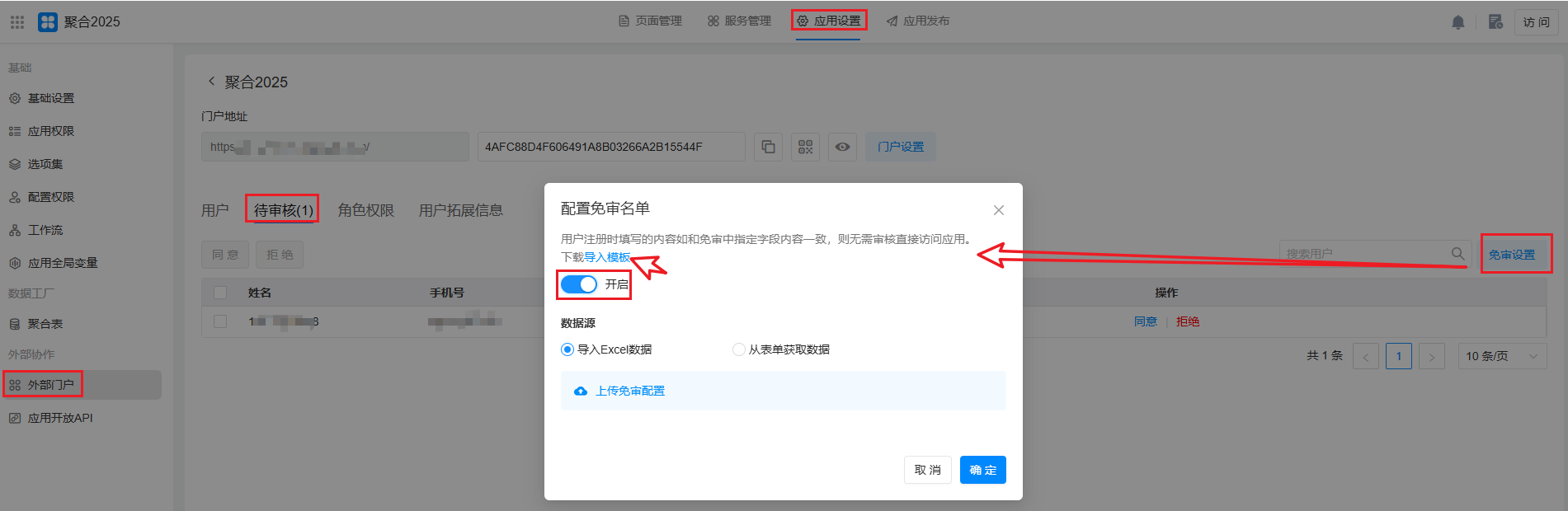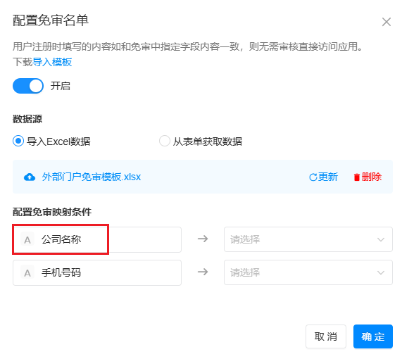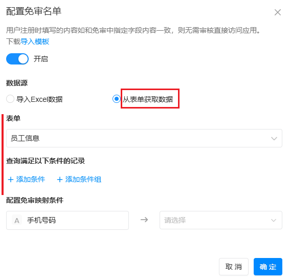 1)免审名单数据来源有两种:导入Excel数据 和 从表单获取数据