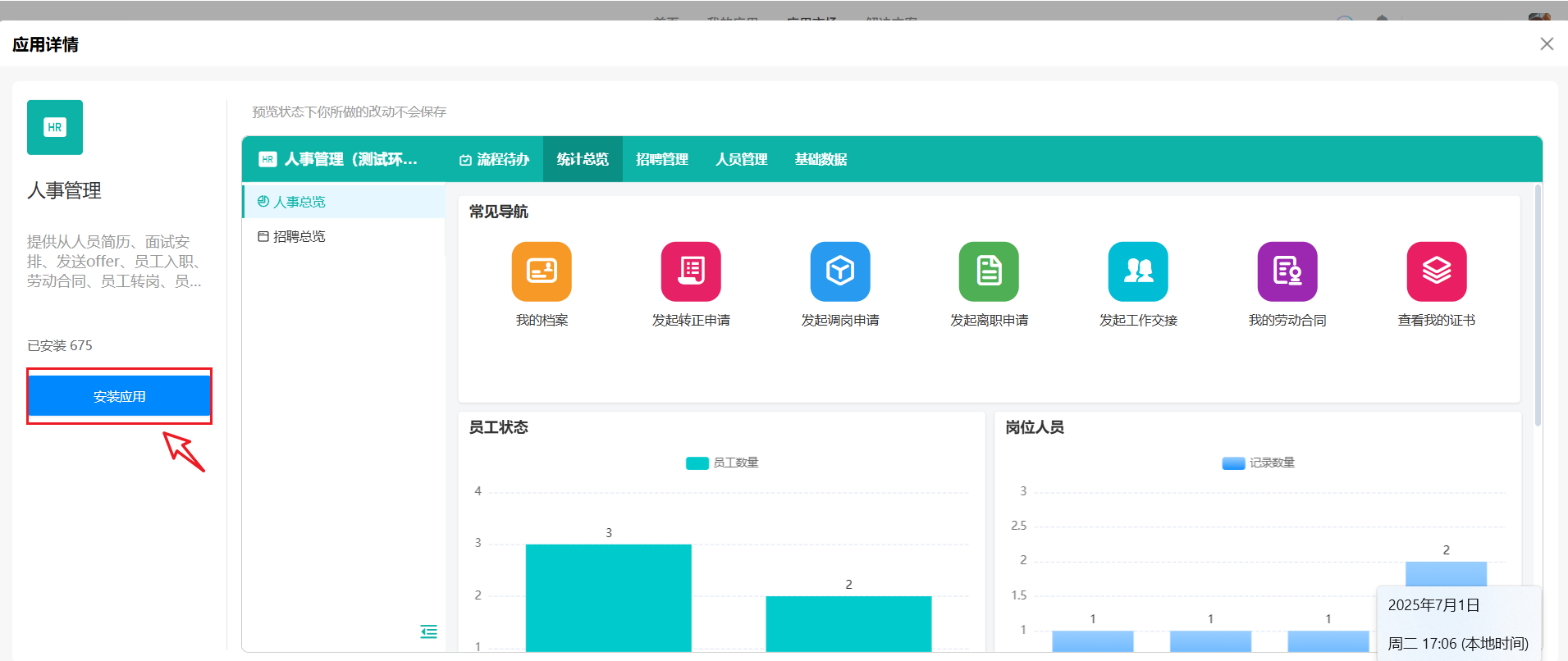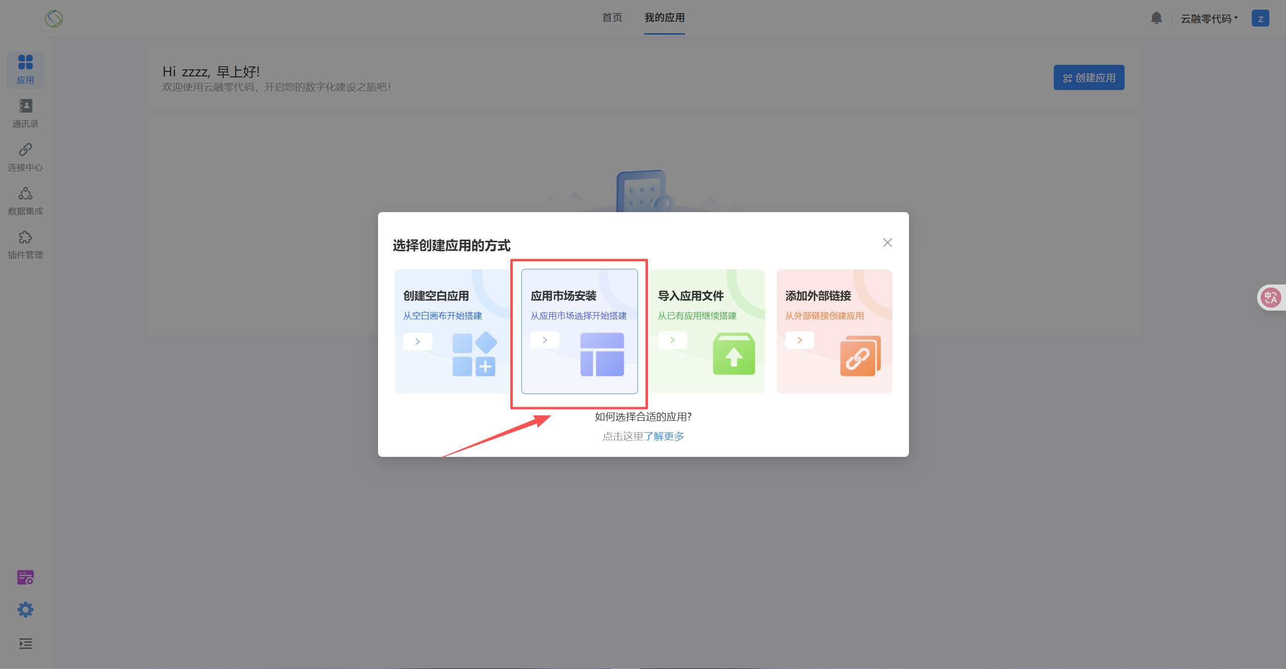 选择应用市场安装 在「应用市场」页面,点击应用“查看详情”进入应用预览页面。