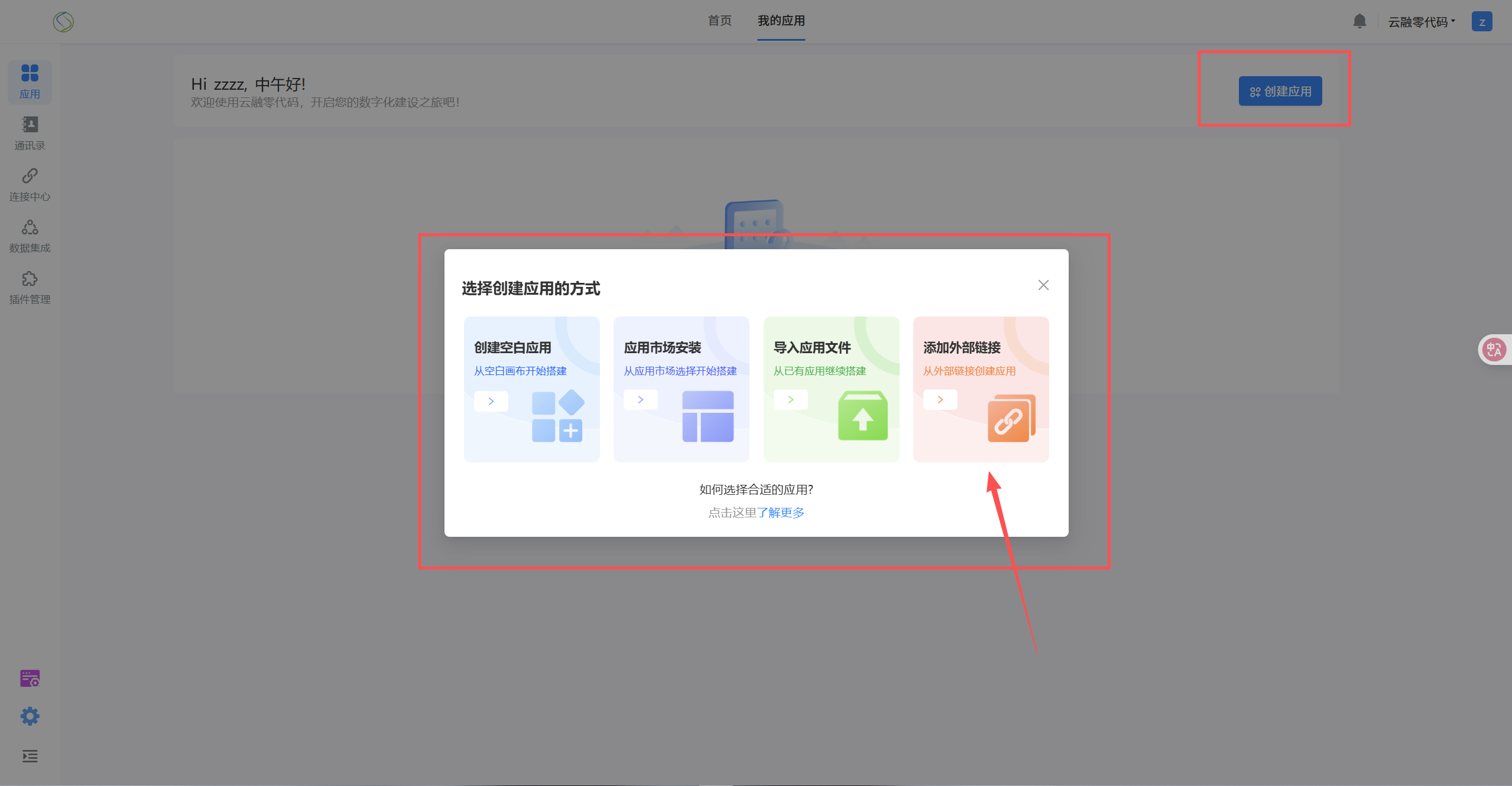在「我的应用」页面,点击右上角的「创建应用」,打开创建应用弹窗。
