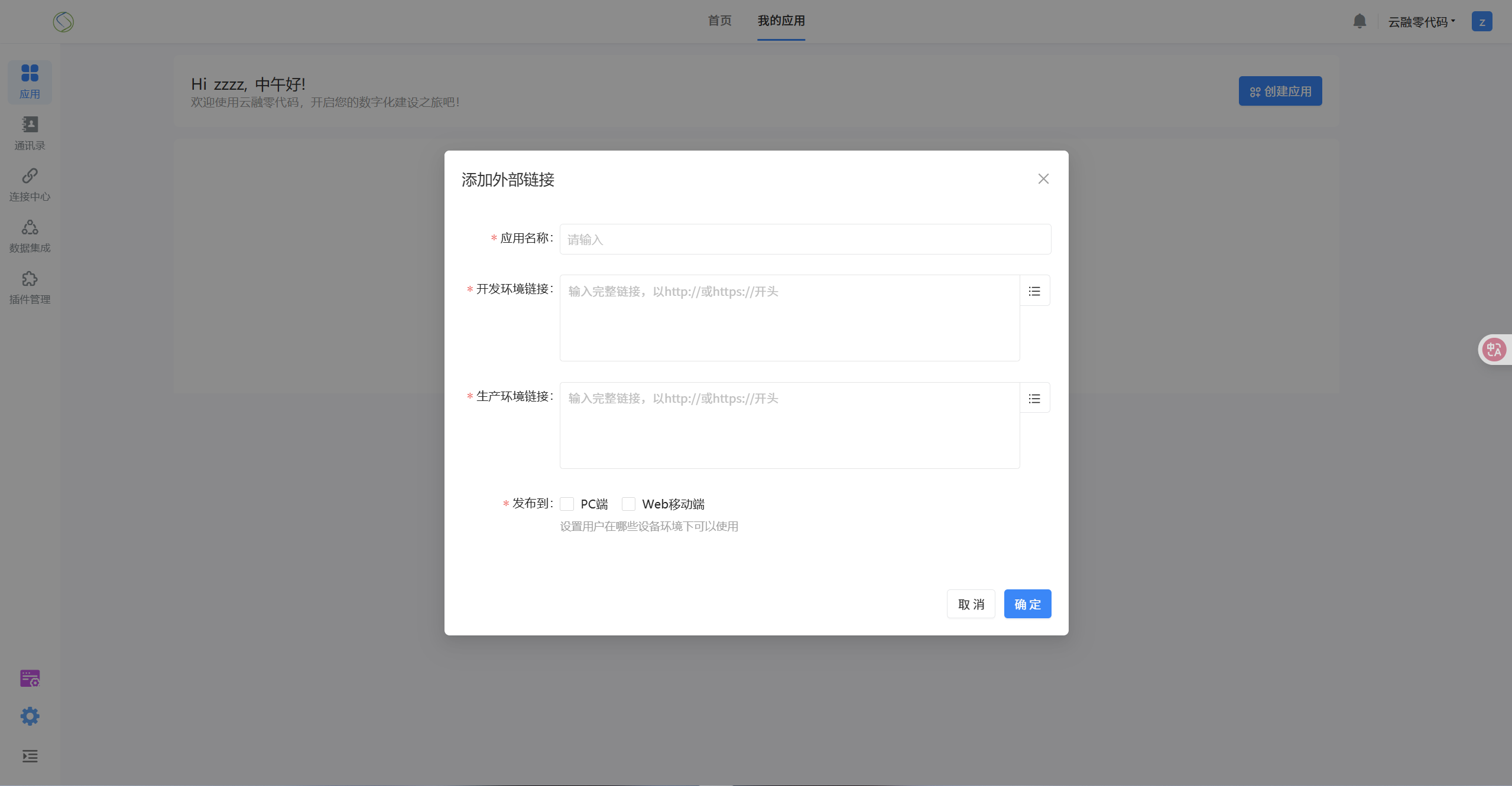 选择添加外部链接 填写 应用名称,环境链接,点击下面的「确定」即可。