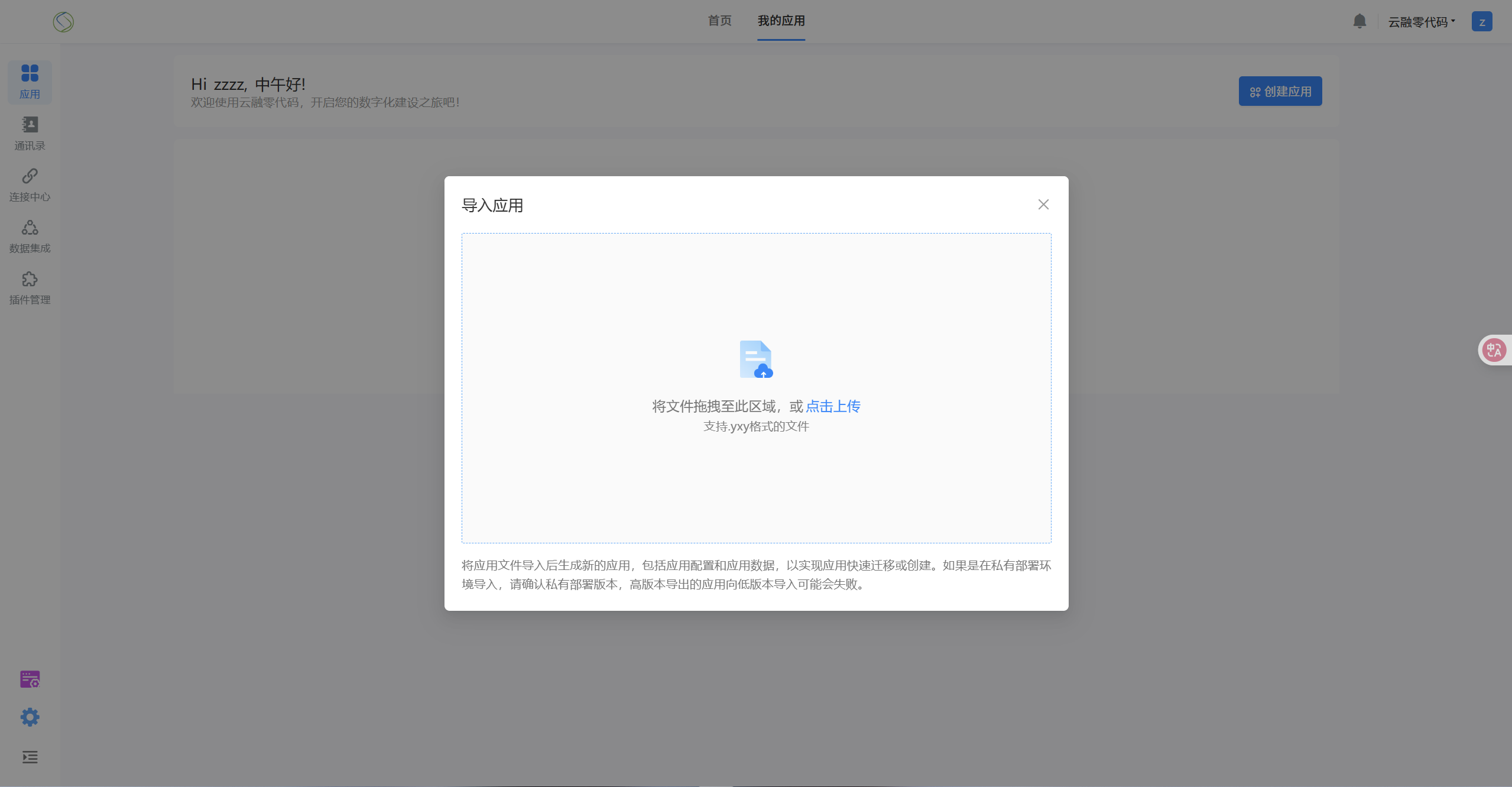 选择导入应用文件,弹窗导入应用上传窗。把要导入要上传应用即可。
