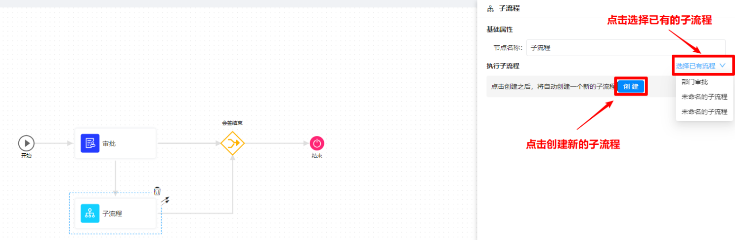 执行子流程有两种方式:创建新的子流程 和 选择已有流程。