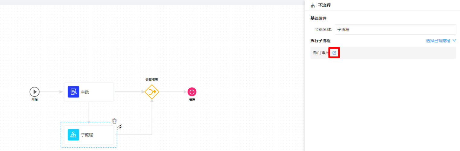 创建或者选择完子流程后,点击子流程后面的按钮可以跳转到子流程编辑页面。