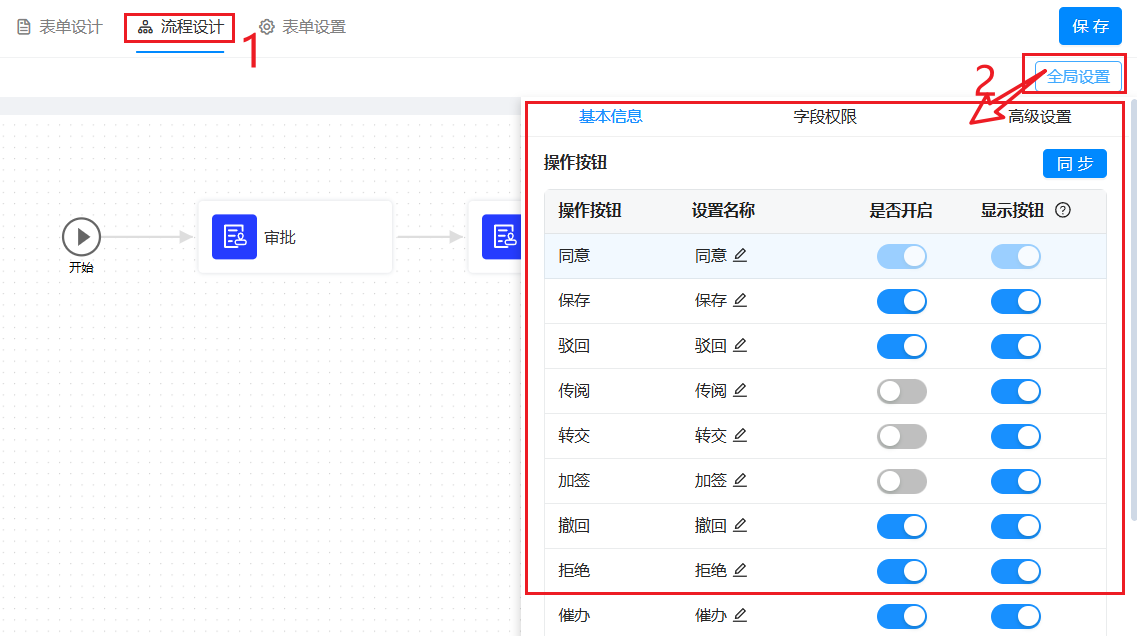 通过全局设置,可以统一配置流程中所有节点的操作按钮、字段权限、审批规则等,减少重复配置,提升流程设计效率。