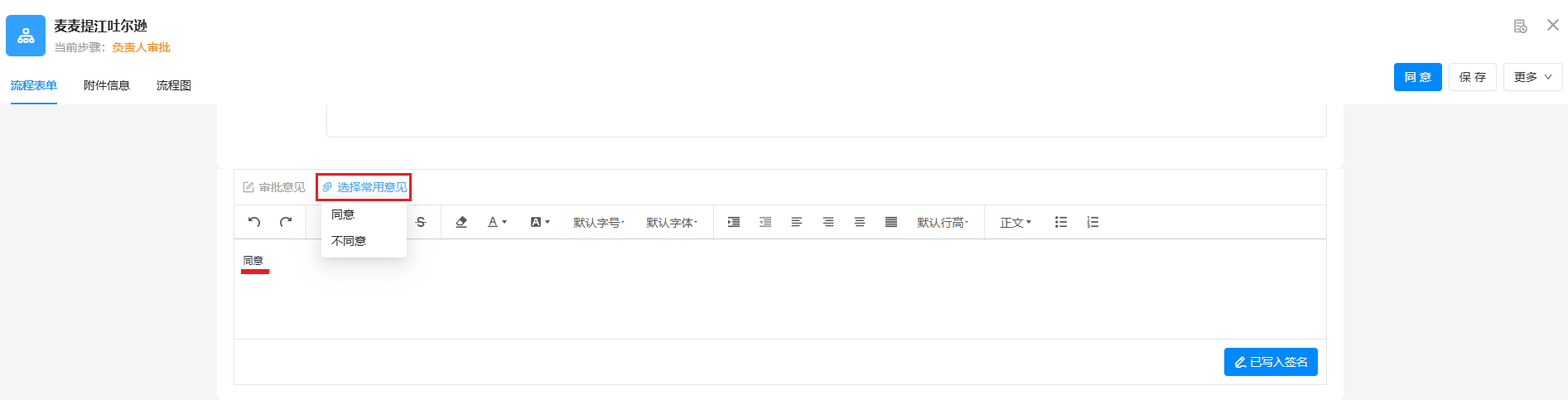 为方便节点负责人快速提交操作意见,提升流程审批效率,支持预设默认操作意见和快捷选项。最多可设置 6 个快捷选项。设置完成后,点击「保存」设置。
