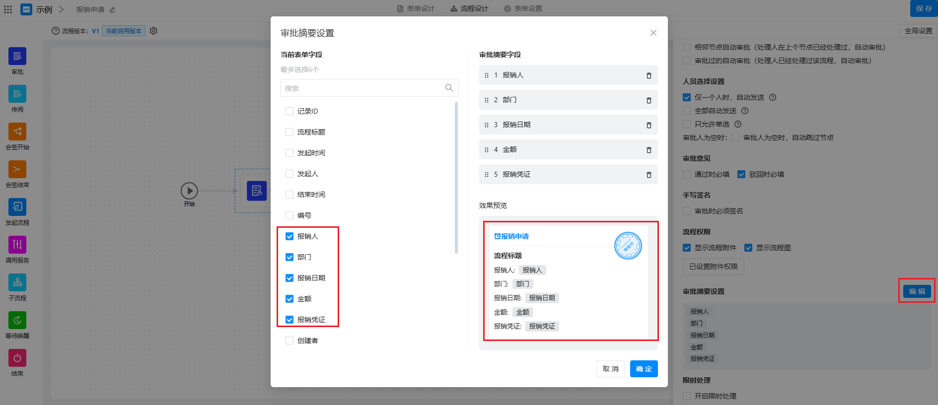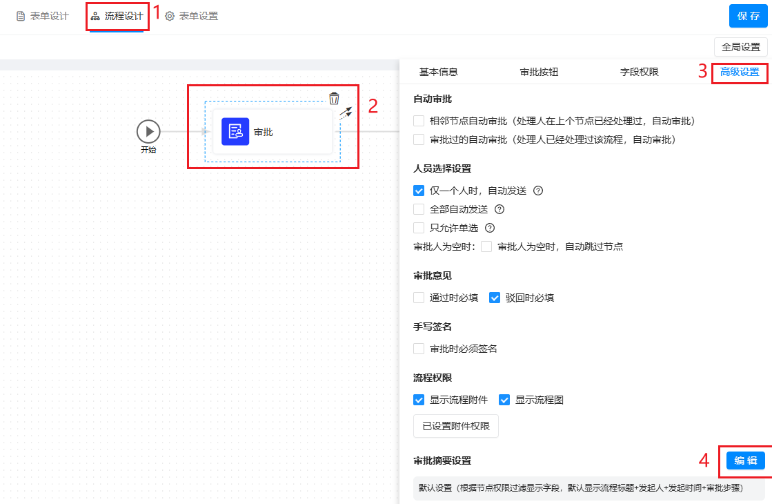 应用搭建流程设计节点属性高级设置审批摘要本页总览审批摘要 审批摘要设置是优化审批流程信息展示的重要功能。通过设置审批摘要,手机端接收待办审批通知,在 待办通知 中显示关键字段信息,帮助用户快速了解审批任务的核心内容,提升审批效率。 演示效果 选择摘要字段后, 在移动端 待办通知 中列表中可以直接显示摘要字段以快速预览关键信息。 操作步骤 开启入口 进入「流程设计」,选中流程节点,在「节点属性 >> 高级设置」审批摘要设置。如下图所示: 💥 Tips: 1️⃣审批 摘要默认显示流程标题+发起人+发起时间+审批步骤 2️⃣审批摘信息会根据节点权限过滤显示字段,