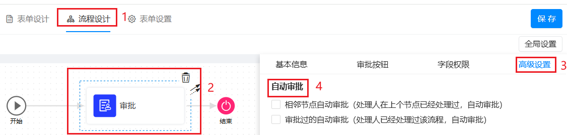 进入「流程设计」,选中流程节点,在「节点属性 >> 高级设置」自动审批选项。如下图所示: