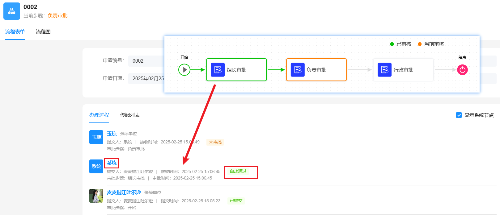 在办公用品申请流程中,如果流程设置为 组长审批 > 负责审批 > 负责审批,并且 组长审批节点 的审批人为空,可以通过以下方式实现自动跳过该节点,使流程顺利流转到下一个节点: