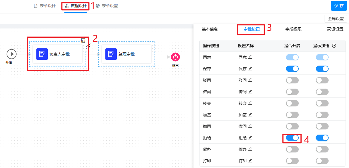 进入「流程设计」,选中需要设置拒绝的流程节点,在「节点属性 >> 审批按钮」处开启「拒绝」操作: