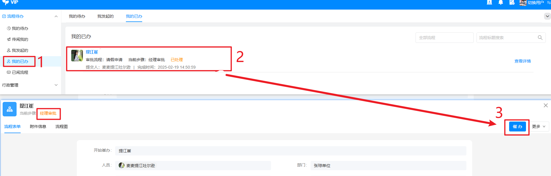 2)非流程发起人,将流程发送至下一步且该步骤仍处于审批状态时,可进行催办操作;