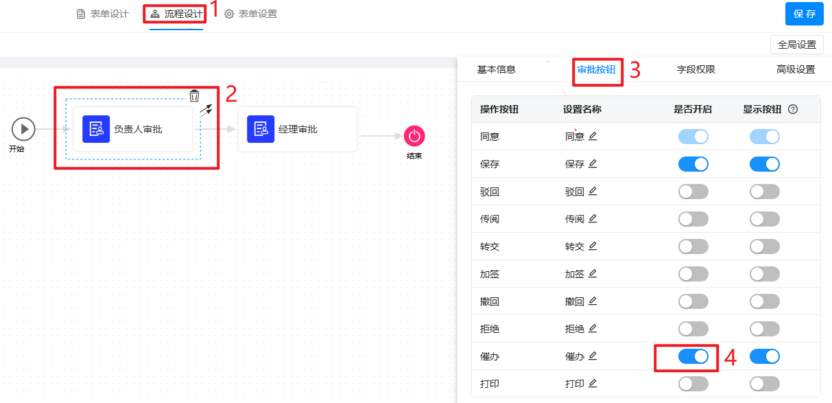 进入「流程设计」,选中需要设置催办的流程节点,在「节点属性 >> 审批按钮」处开启「催办」操作: