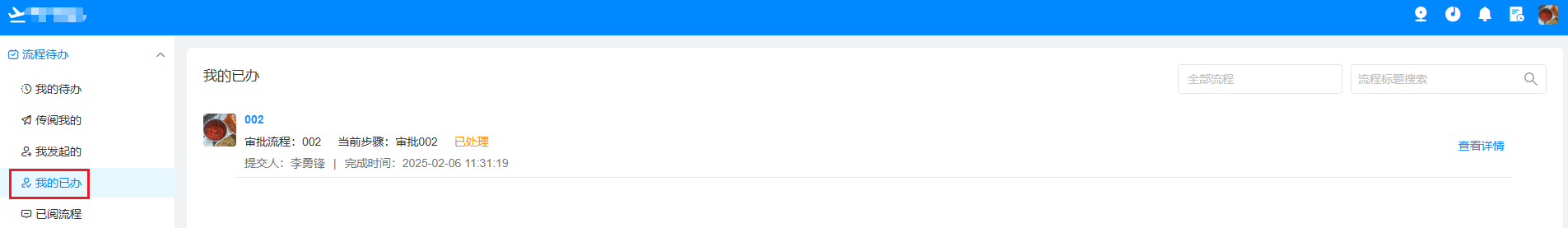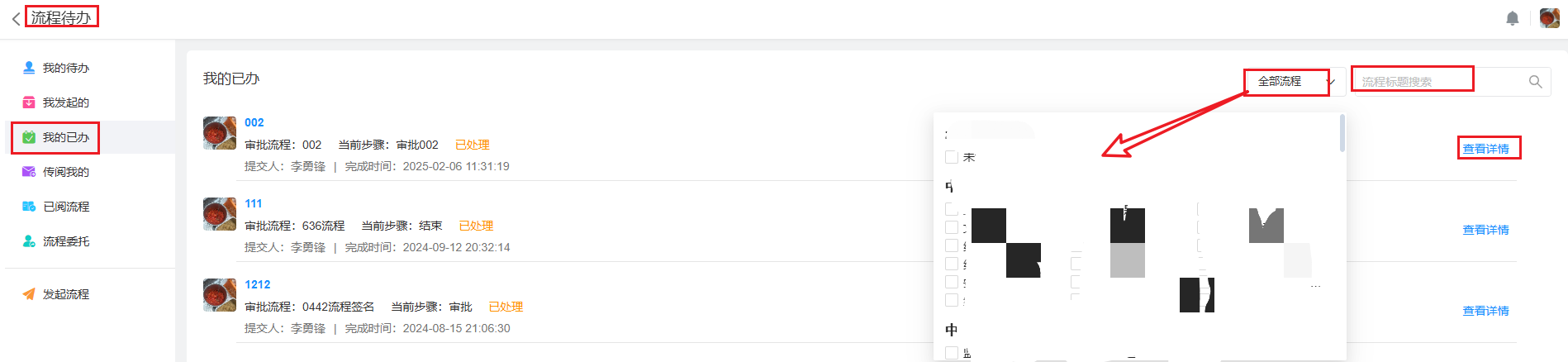 如果是流程中心的的「我的已办」流程搜索,则搜索范围为整个企业的「我的已办」流程。如下图所示: