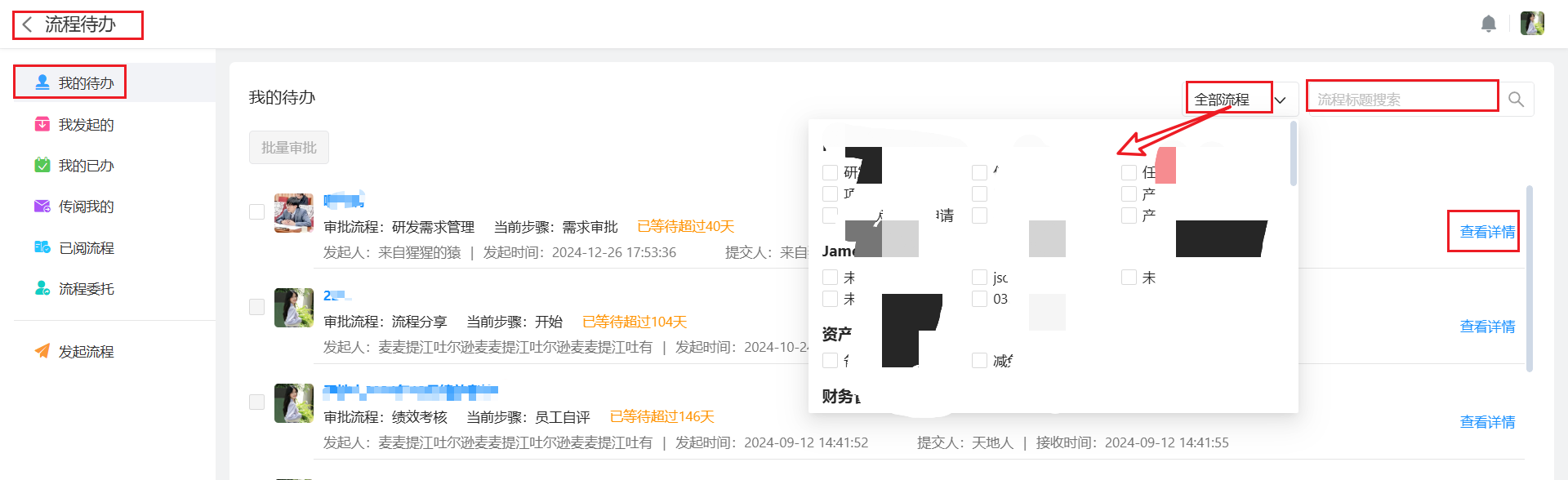 如果是流程中心的的「我的待办」流程搜索,则搜索范围为整个企业的「我处理的」流程。如下图所示: