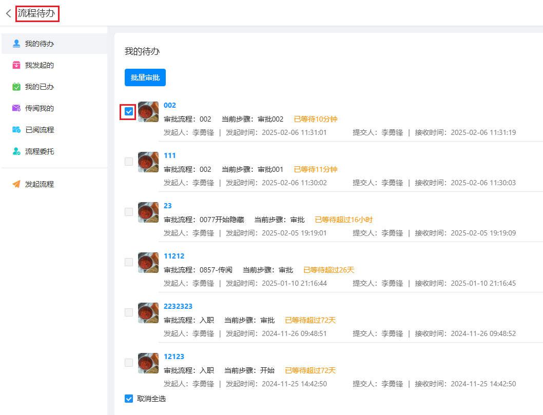 未设置「开启批量审批」操作的节点勾选框为禁用状态,即不支持批量提交。