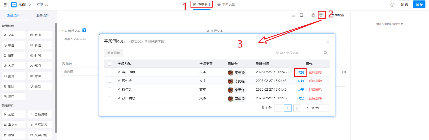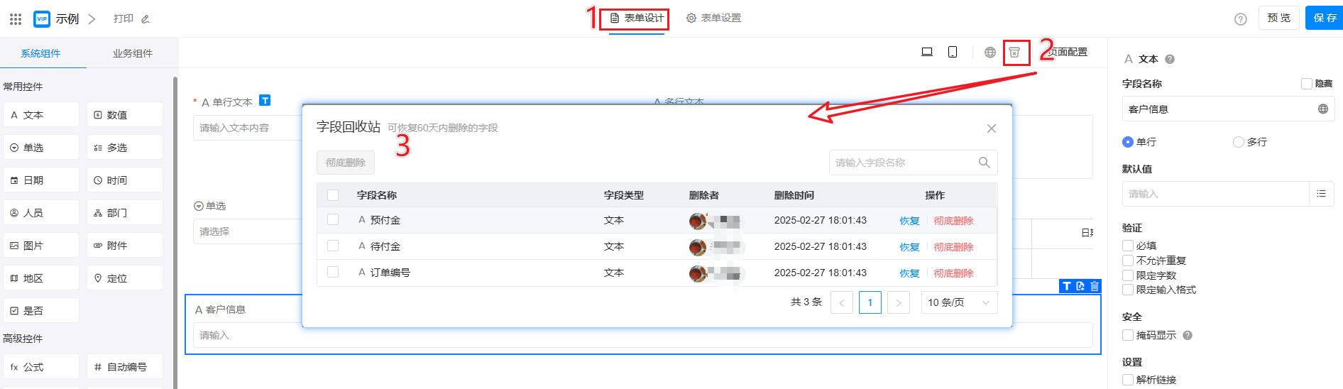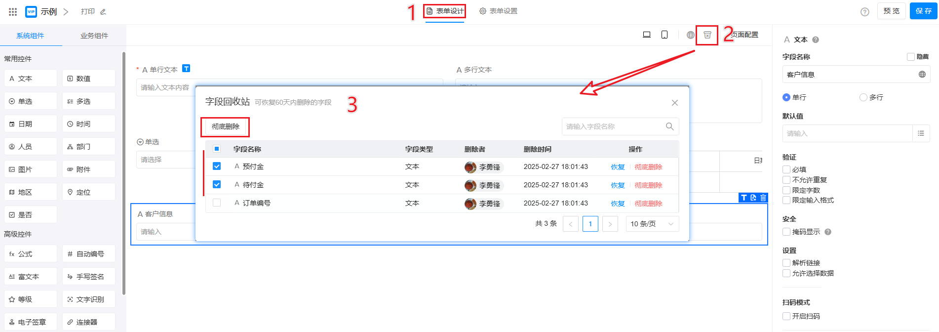 设计表单的过程中,如删除了表单中的字段,则该字段的数据也将一同被删除。字段回收站,可恢复已删除的字段及其数据,或彻底删除该字段。