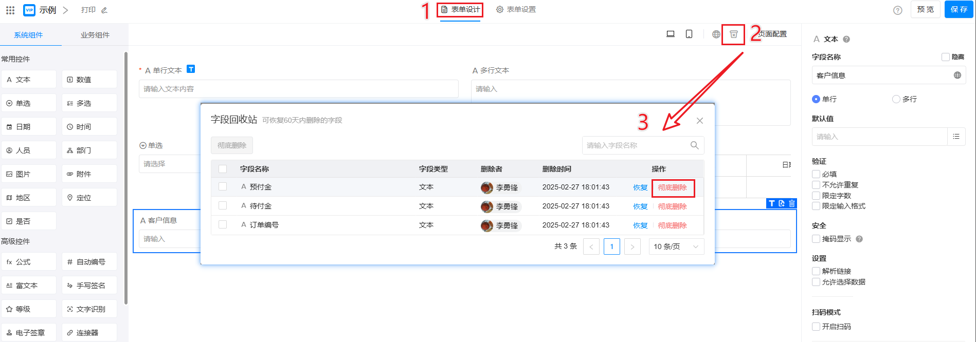 设计表单的过程中,如删除了表单中的字段,则该字段的数据也将一同被删除。字段回收站,可恢复已删除的字段及其数据,或彻底删除该字段。