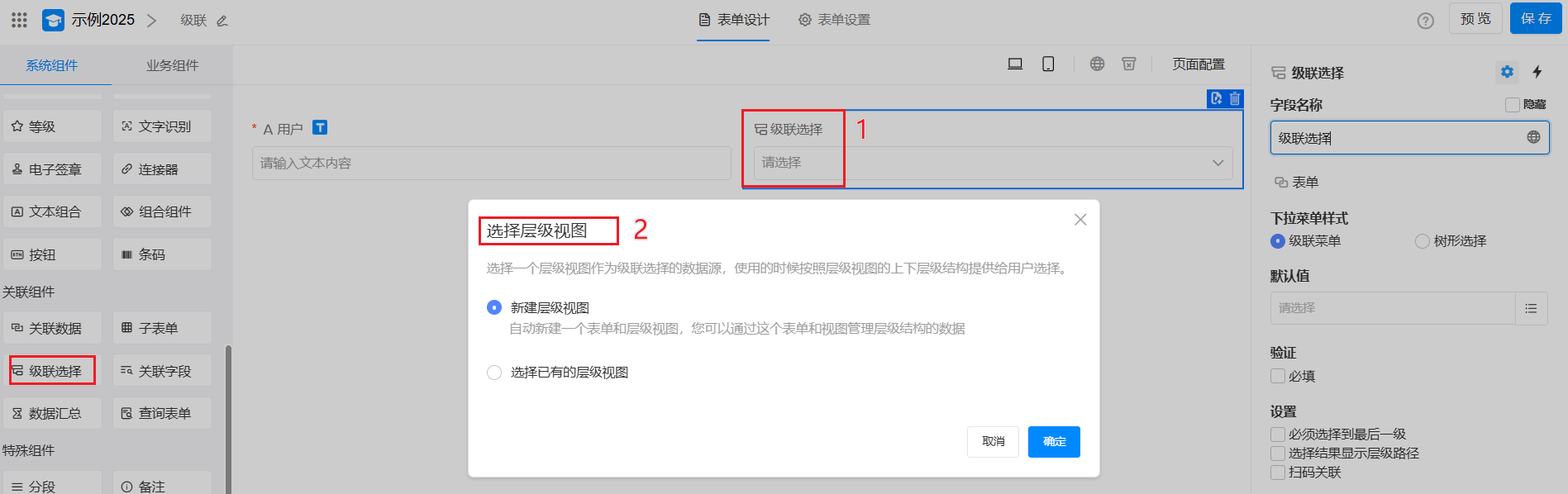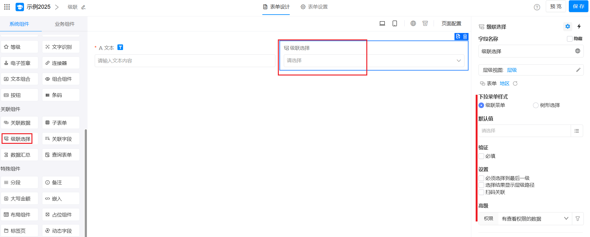 级联选择需要配置数据源,它的数据源本质是一个含有层级视图的工作表。因此本表和数据源表是关联关系。