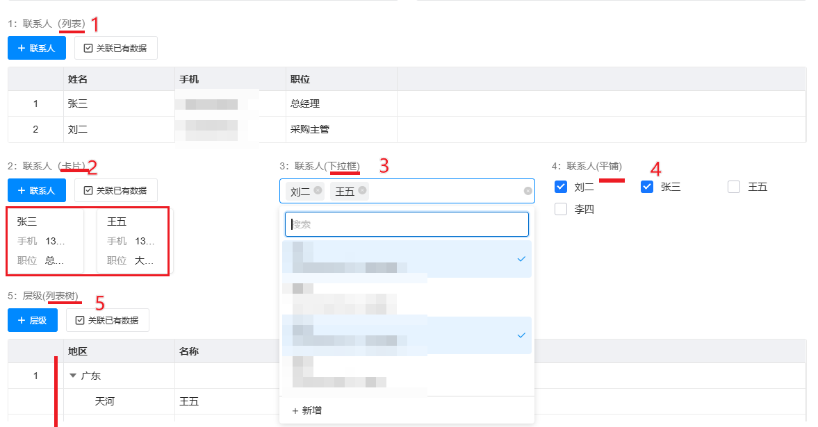 | 下拉框选择 | 通过下拉框选择并显示关联的记录,适用于关联项较少且需要快速选择的场景。 | 关联项较少(例如少于10条),且需要快速选择和操作的场景。 |