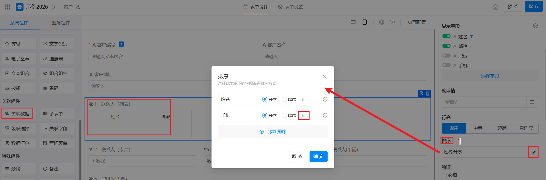 设定一个排序规则,已关联的记录按此规则排序显示。支持多个排序字段,拖拽可以调整优先顺序。