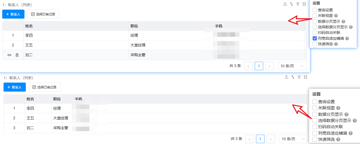 选择和哪个表建立关联关系,我们选择本应用的联系人表。支持跨应用关联。