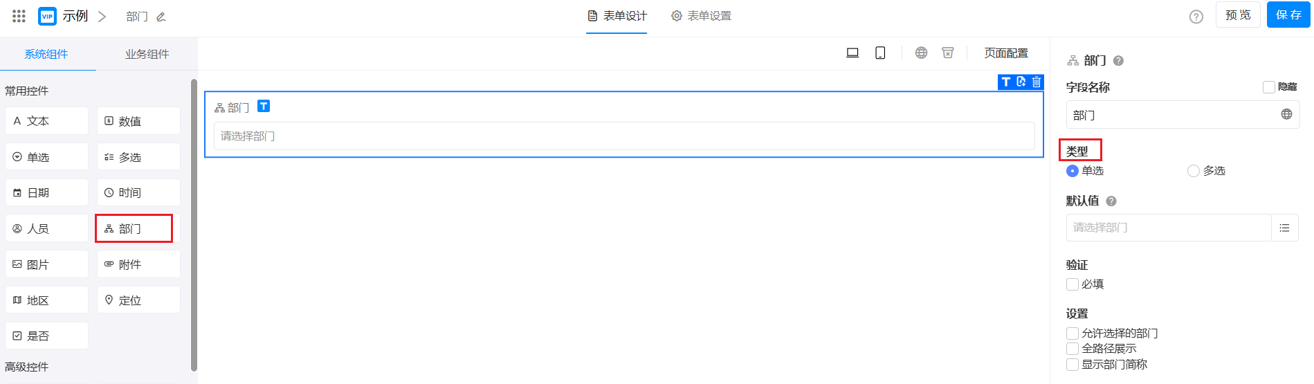 保存后依然可以切换选择方式。如果由多选改为单选,字段中依然显示所有选择部门,但在修改时只有保留一个部门才能保存。
