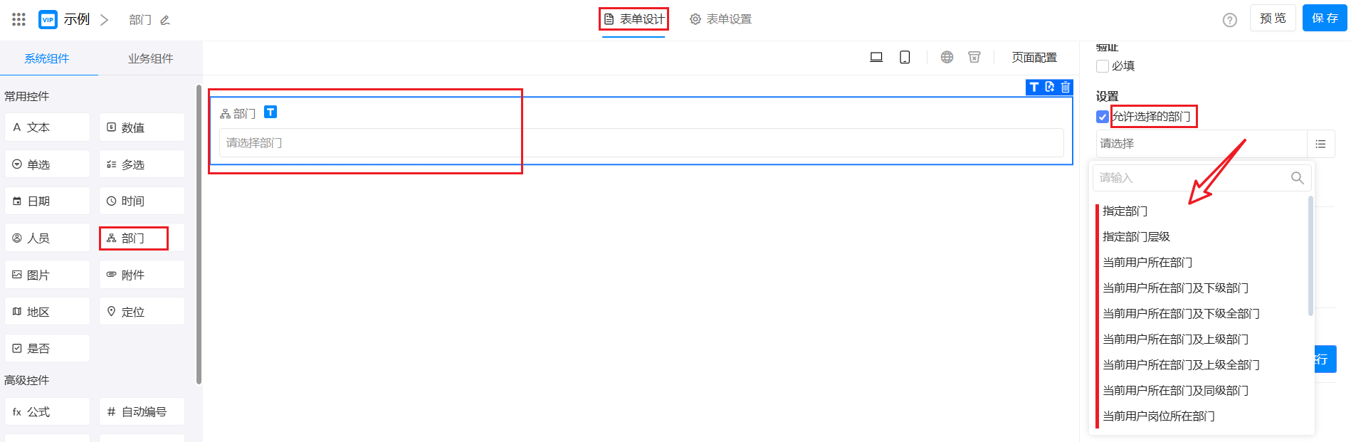 | 指定部门层级 | 允许选择特定层级的部门,需指定层级范围。 | 指定层级为“二级部门”,则只能选择所有二级部门。 |