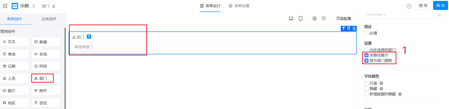 勾选全路径展示后,如果部门有上级部门,则会从最高部门显示层级路径,如果不勾选,则只显示本部门名称。