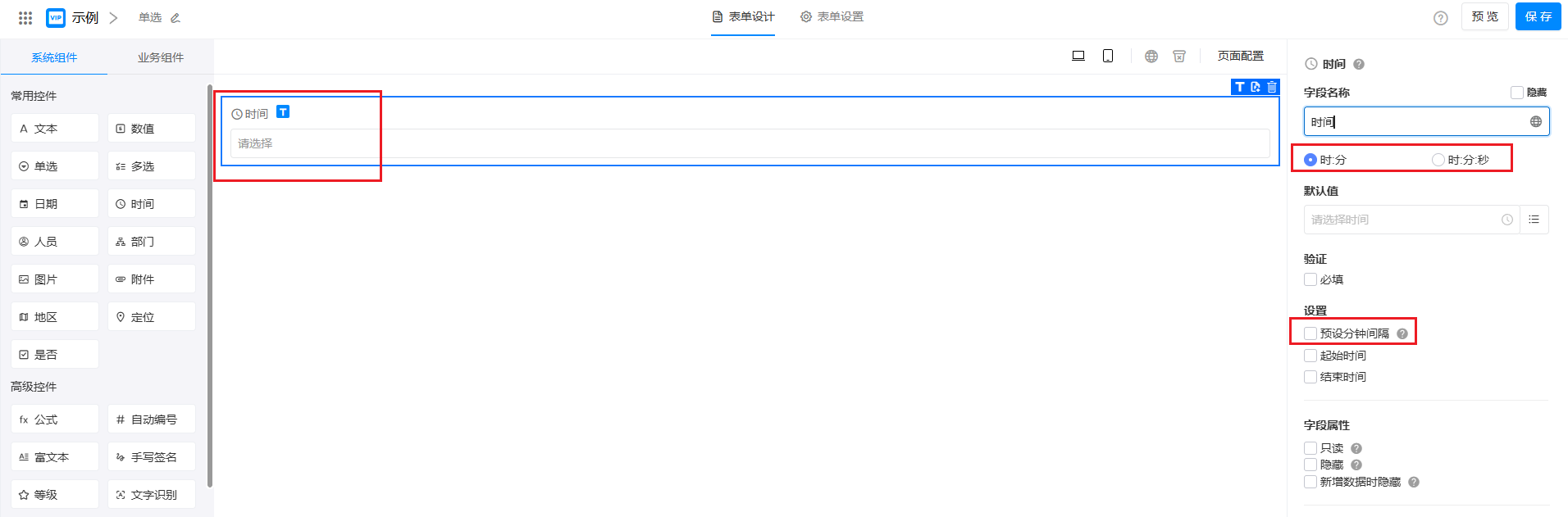 时间字段不含日期,支持时分和时分秒两种显示格式。