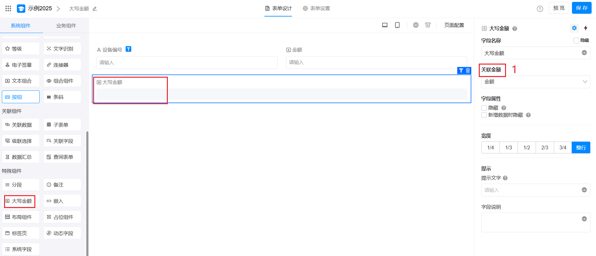 大写金额控件是只读的,无需手动录入,它必须关联在一个数值字段上面,数值一旦录入,就会自动生成和数值对等的大写金额。
