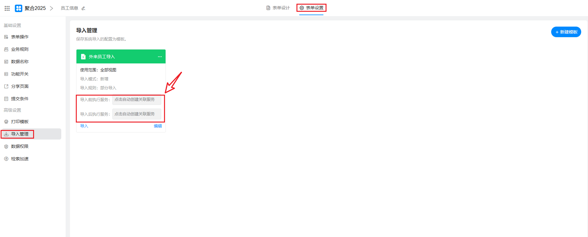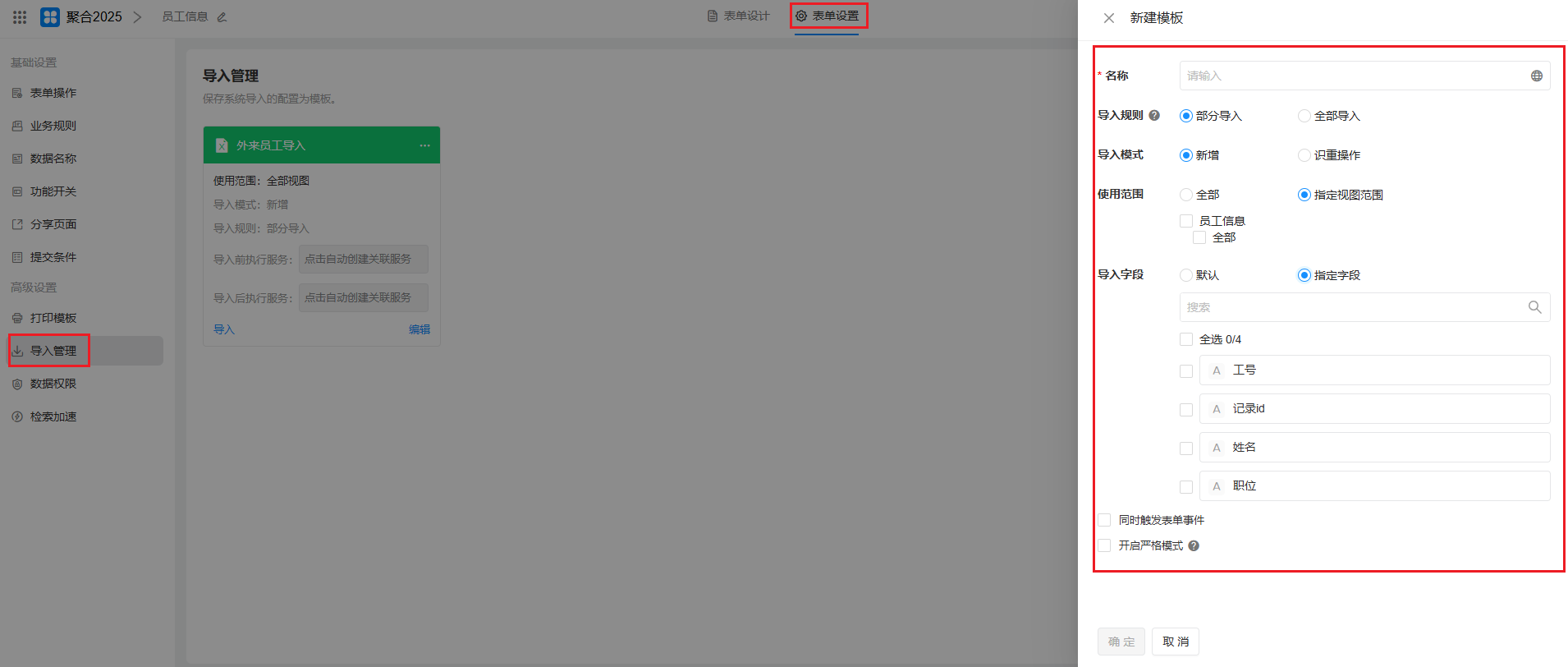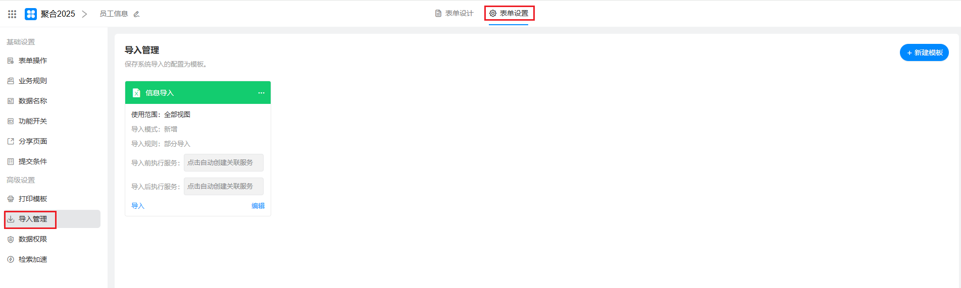 应用搭建表单管理表单设置导入管理本页总览导入管理 不同业务场景或企业往往对导入格式有不同的要求:有时需要的导入字段内容不同,我们可以将配置好的格式保存为模板,导入时直接选择导入设置即可。 设置入口 设置路径「 表单设置 》导入管理 》」。 基础操作
