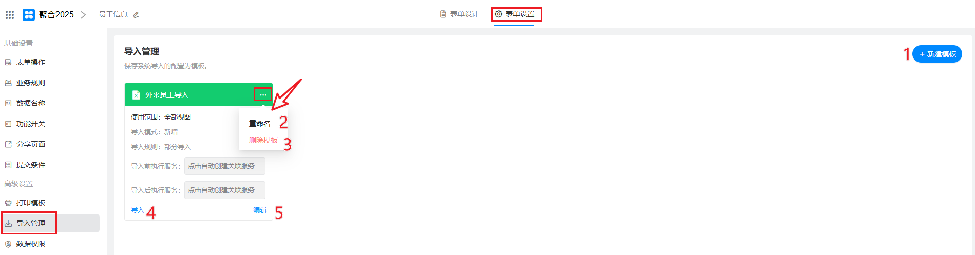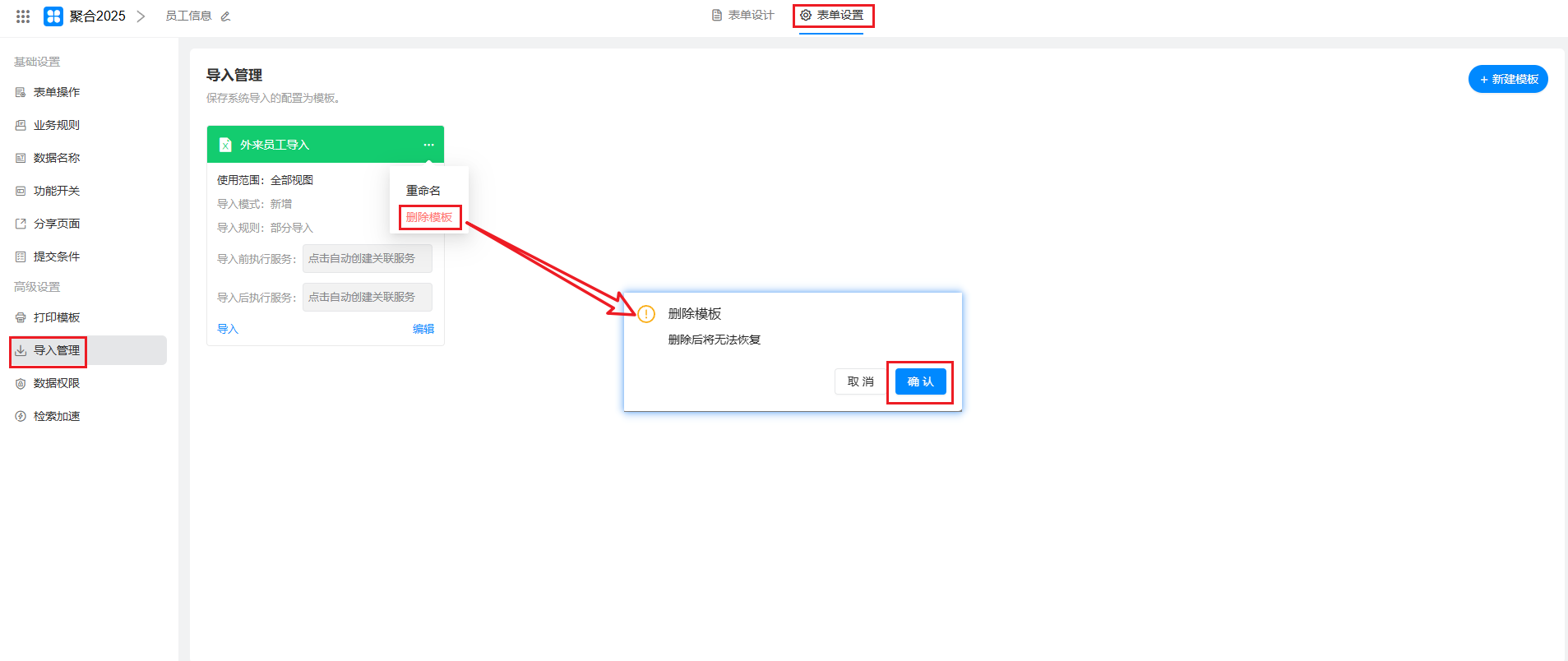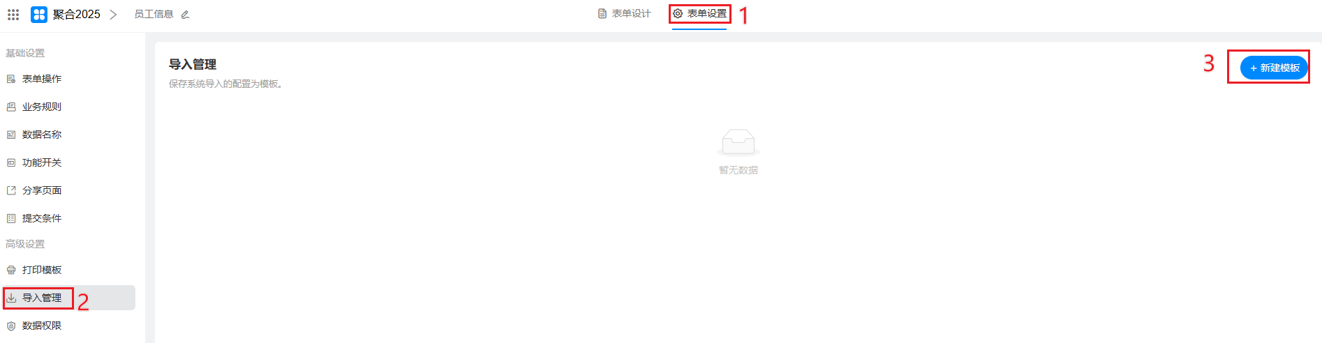 应用搭建表单管理表单设置导入管理本页总览导入管理 不同业务场景或企业往往对导入格式有不同的要求:有时需要的导入字段内容不同,我们可以将配置好的格式保存为模板,导入时直接选择导入设置即可。 设置入口 设置路径「 表单设置 》导入管理 》」。 基础操作