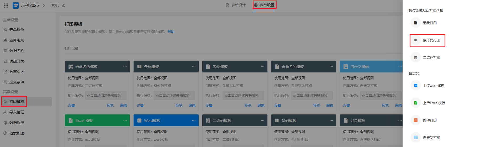 进入表单编辑页面 > 表单设置 > 打印模板 > 新建模板 ,选择"条形码打印",开始创建条形码打印模板。