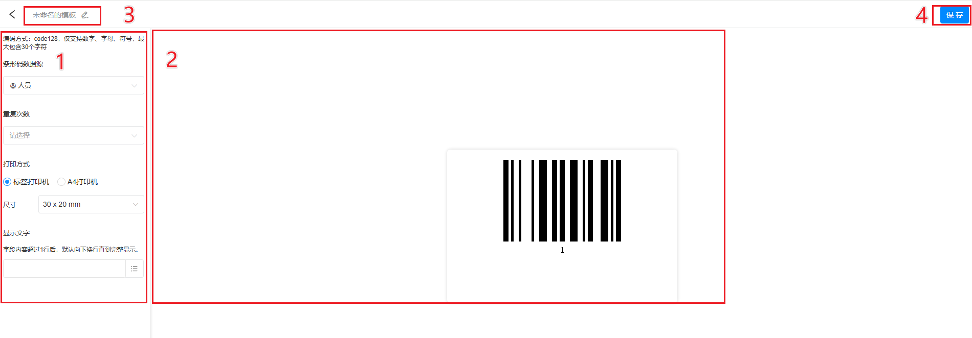 在左侧为打印设置区,可以选择打印的形码数据源、重复次数、打印方式、显示文字、模板名称后保存即可。