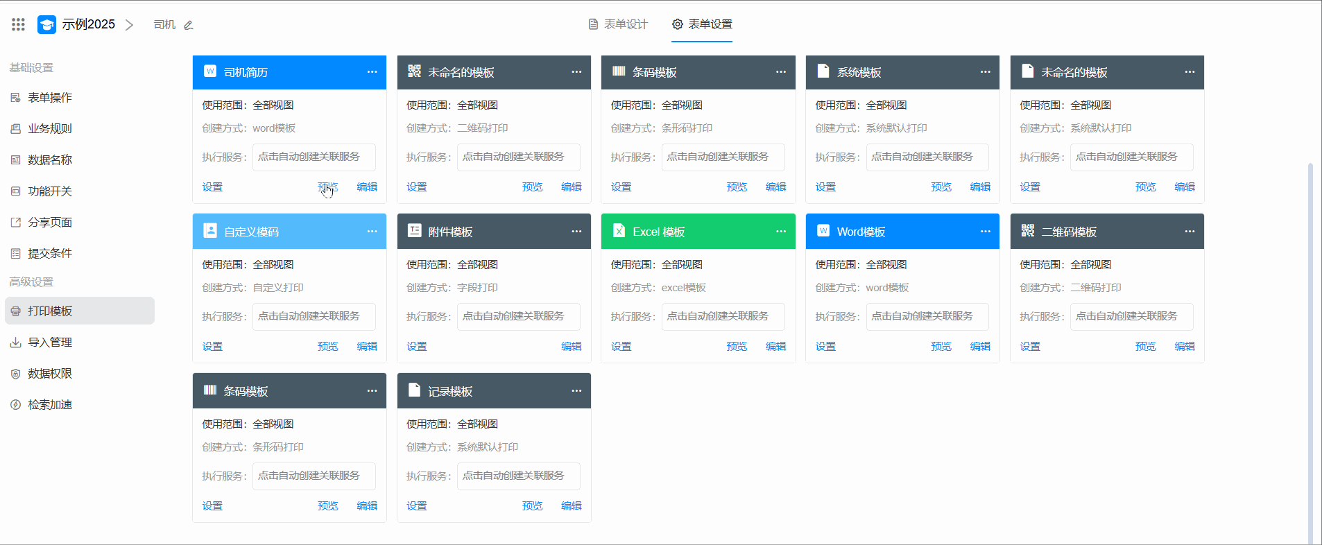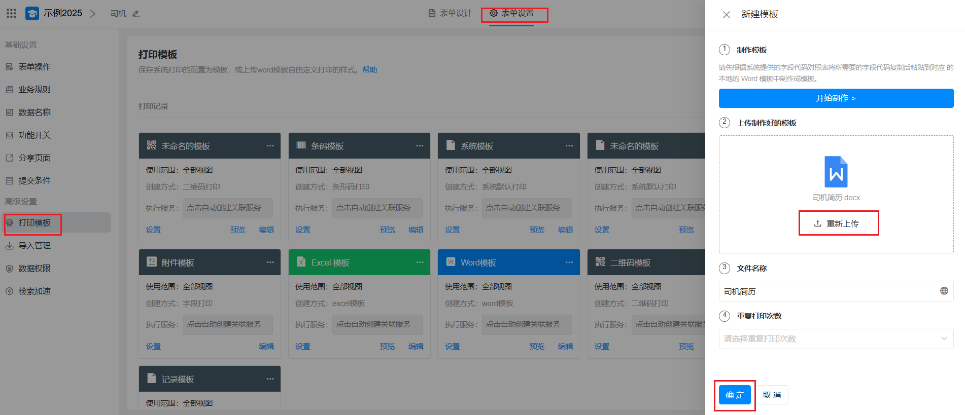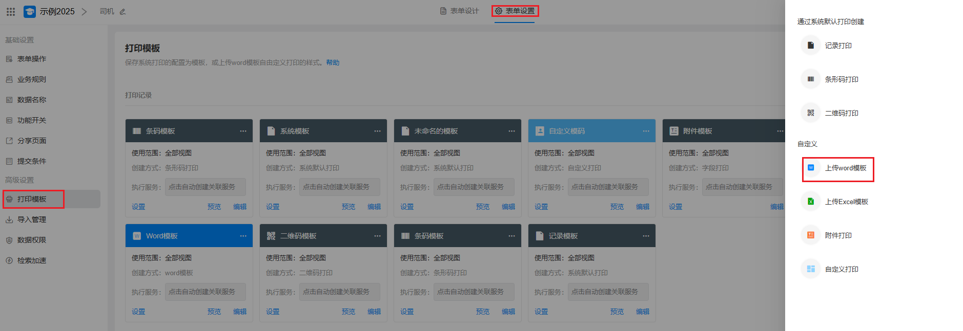 进入表单编辑页面 > 表单设置 > 打印模板 > 新建模板 ,选择"上传word模板"。