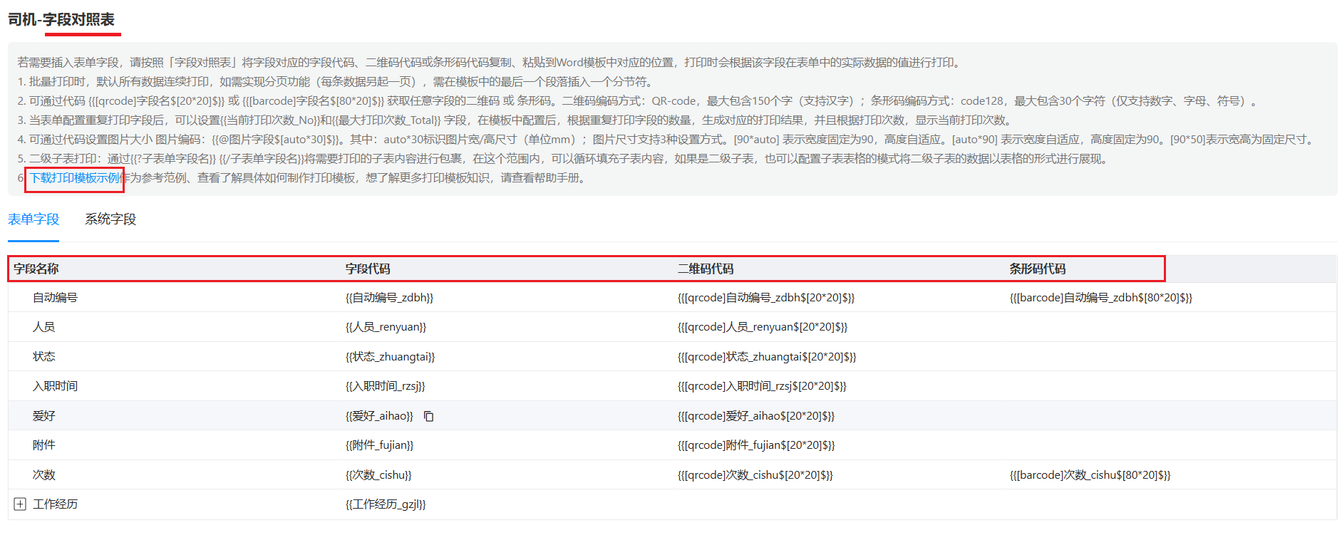 - 二维码代码: 和字段代码的作用是一样的。将此代码粘贴到Word模板中,将以二维码形式对应字段数据。