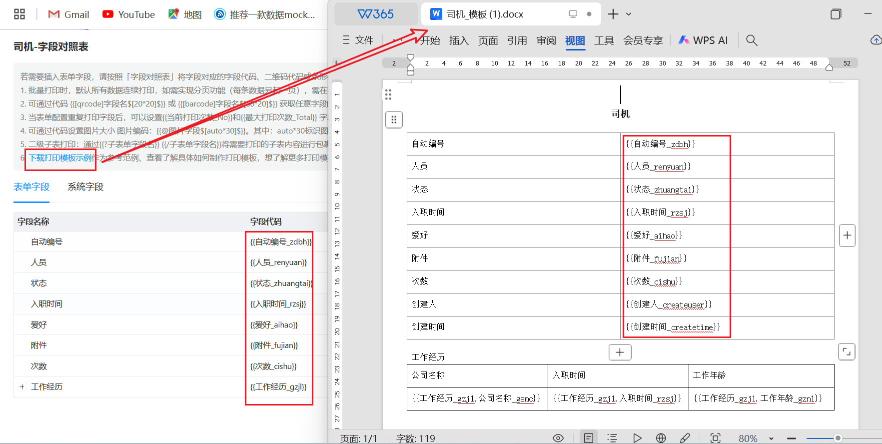 第一次制作Word打印模板,需要知道记录中每个字段对应的字段代码,将字段代码粘贴到设计好的Word中,就可以自动填充数据了。